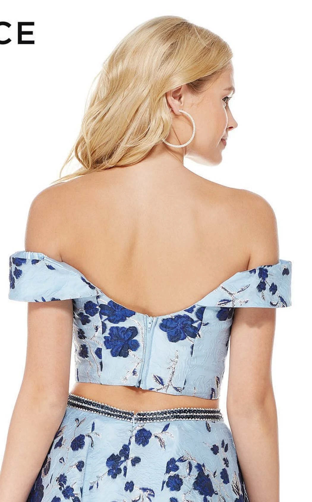 Look Dazzling in this Alyce 3775 by Alyce. This dress features A-Line, Blue, Columbus19, eoy2019, Floral, Glittering Accents, Homecoming Dresses, Mini, Natural, No, Party Dresses, Prom Dresses, Short Sleeve, Two Piece, Unique Neckline