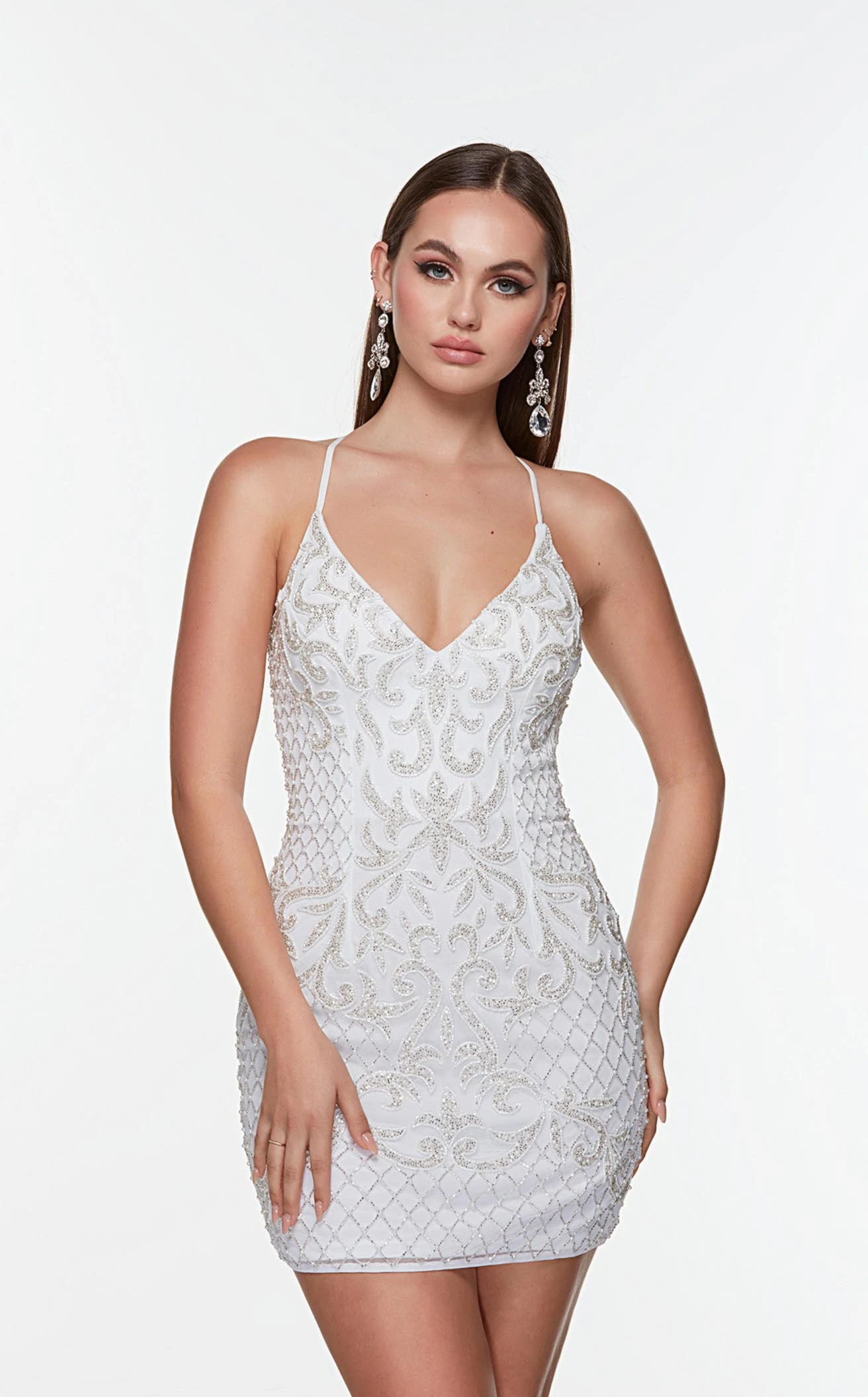 The dazzling and eye-catching gown by Alyce 4506 is ideal for your next special occasion. Beautiful fitted dress with a V-neckline and lovely adjustable straps that fall along the back and create a stunning open back. Beautiful fitted gown with intricate beadwork that will make you the center of attention on the dance floor.