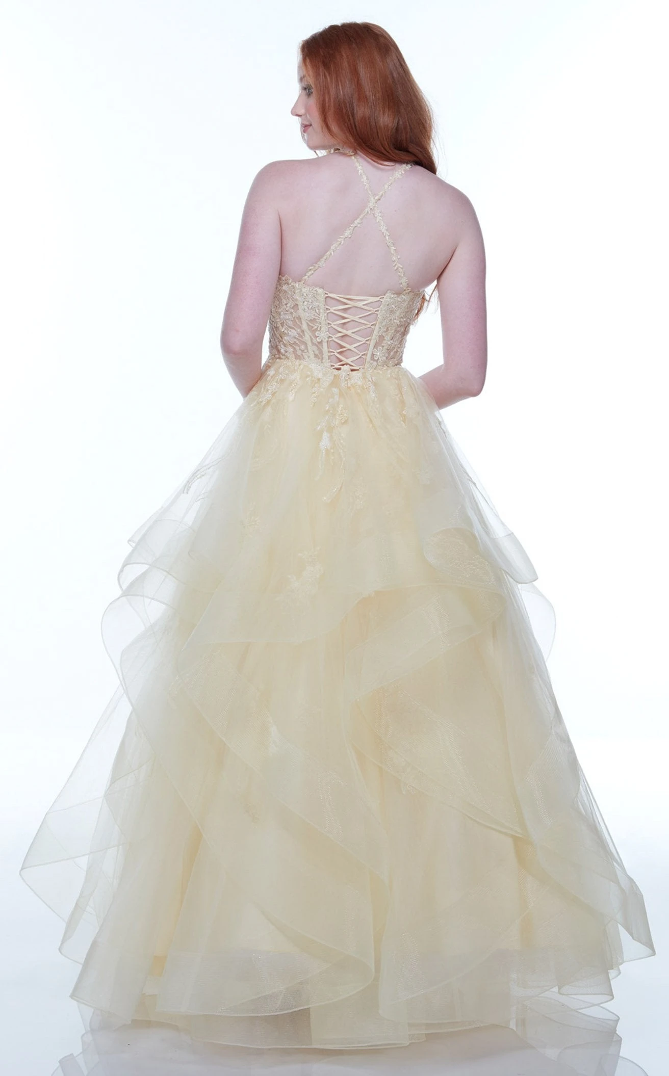 This sweet honey to the eyes long gown by Alyce 61094 with an illusion bodice covered with tulle-lace comes with a sweetheart neckline. Featuring a gorgeous strappy back, this gown ensembles a sheer embroidered bodice with a ruffle layered skirt that adds the most volume to his dress. The ruffles are decorated with sparkling floral embroidery to make this dress look even prettier.