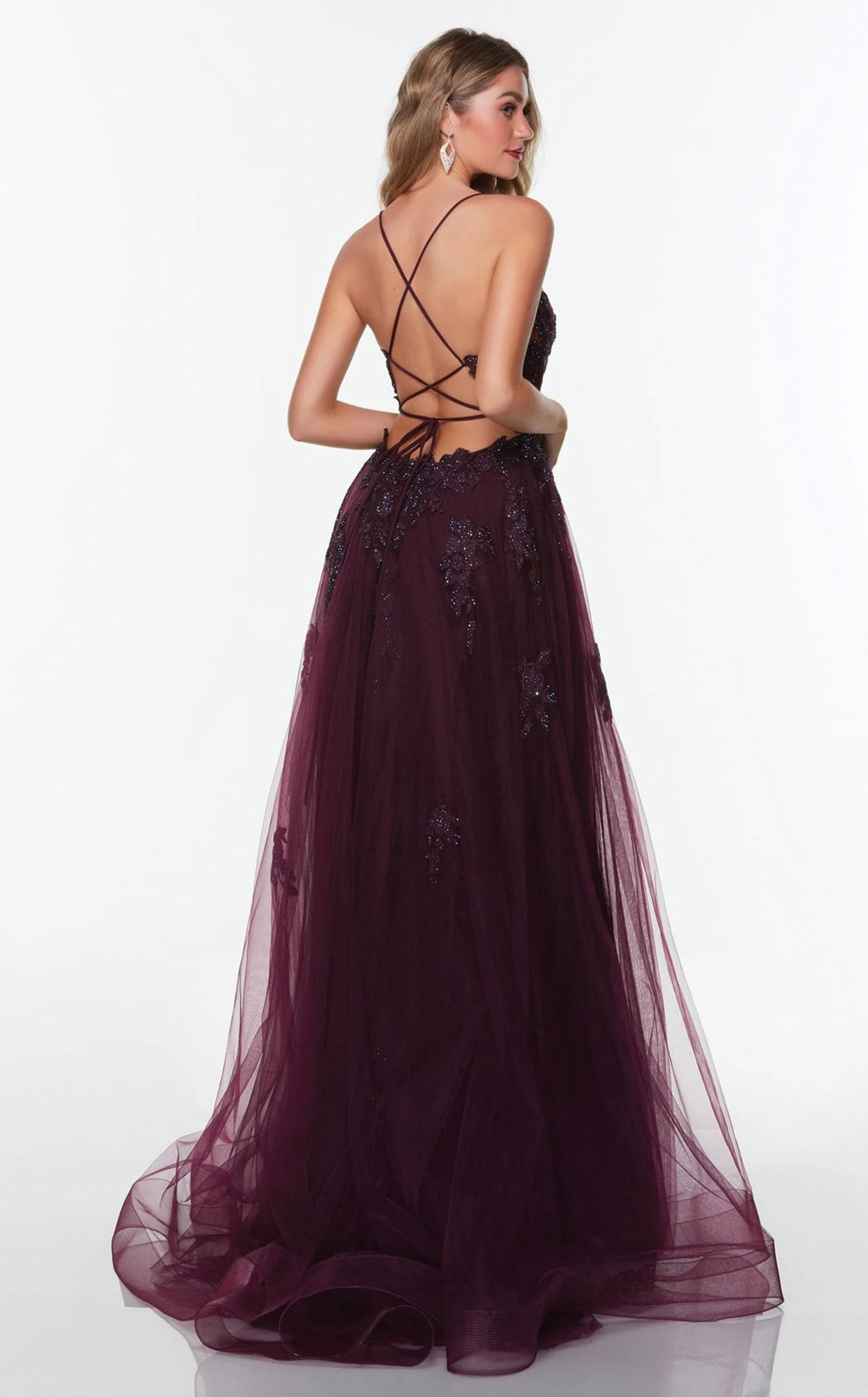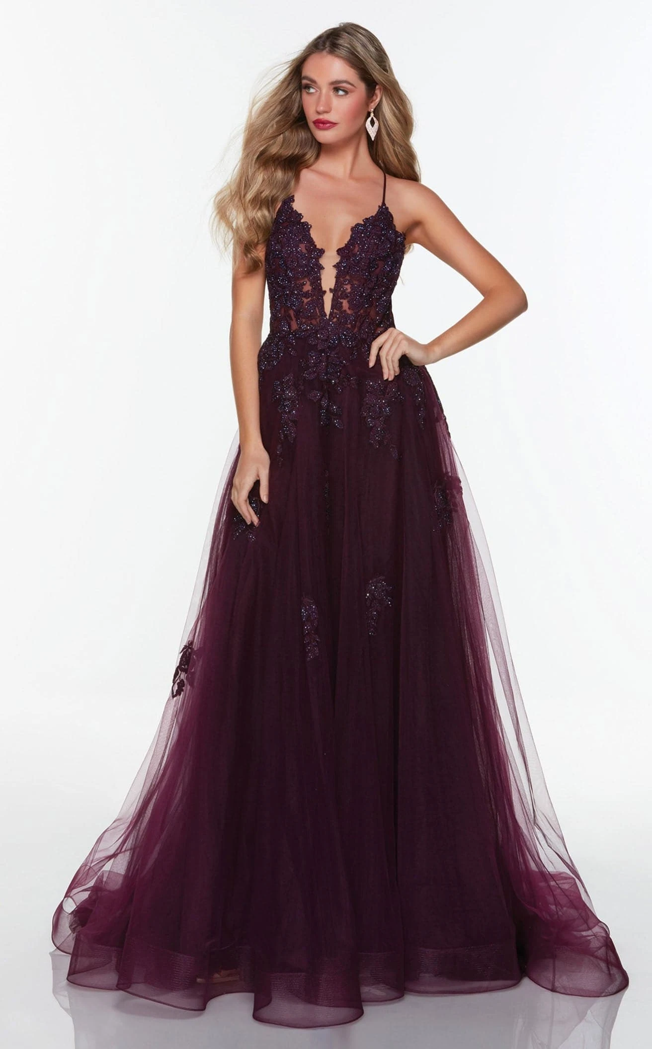 In the most romantic of styles, this sheer bodice dress by Alyce with plunging neckline is perfect for any event. The dress features a strappy back and an easy pull-on style. The lace and sequin embellishments on the skirt add an extra pop of elegance. The torso is adorned with floral lace appliques that adds all the glam to this look. The A-line silhouette flares to the floor in a full-length hem and a sweeping train.