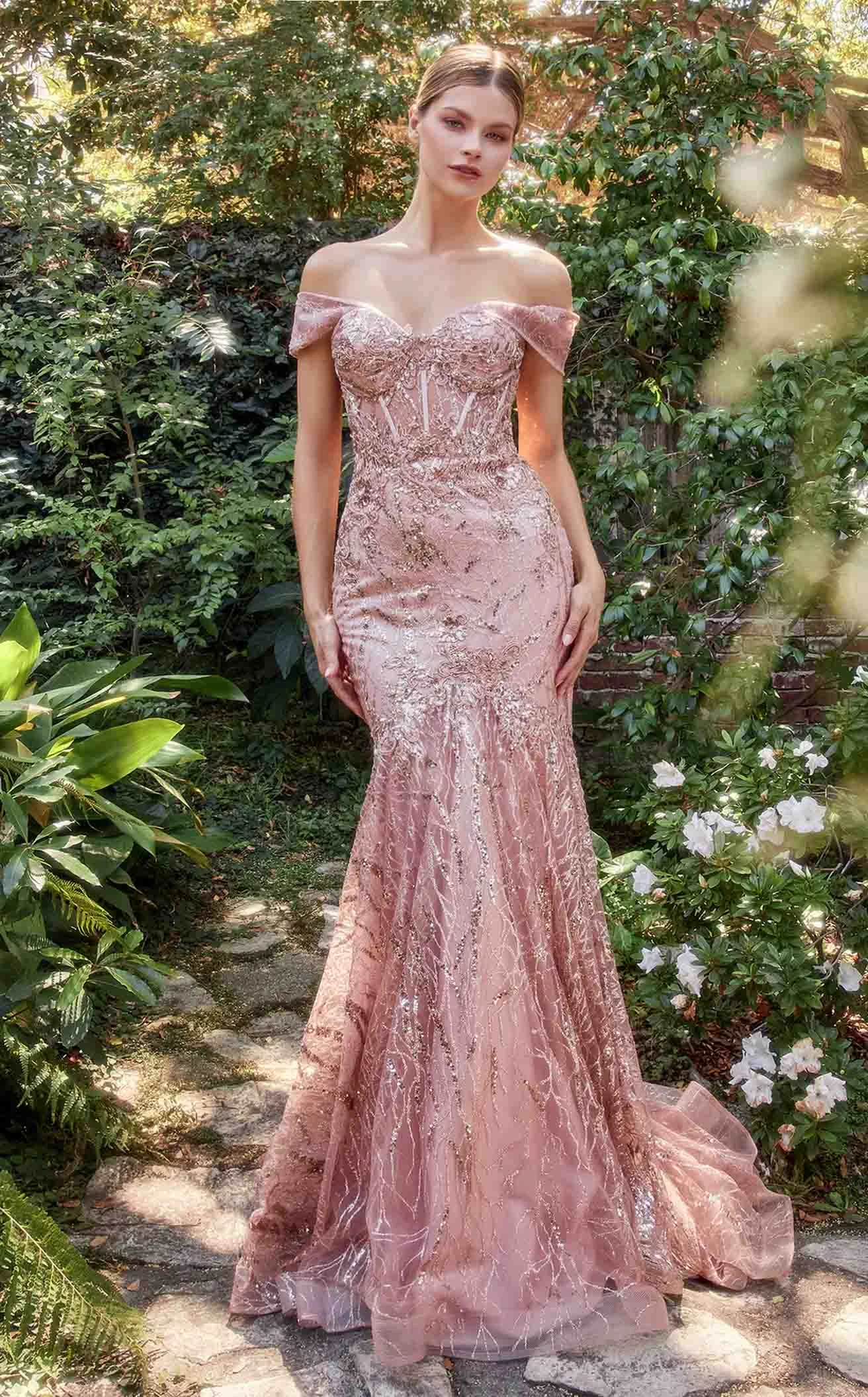 Steal the entire show by alluring all the attention with this strikingly beautiful dress by Andrea and Leo A1107. It comes with a sweetheart neckline and off-shoulder sleeves. The fitted bodice has illusion-boned lines. The dress has intricate sequin embellishments throughout. With a heavily adorned sequined natural waistline, the dress follows a full-length mermaid tulle skirt.