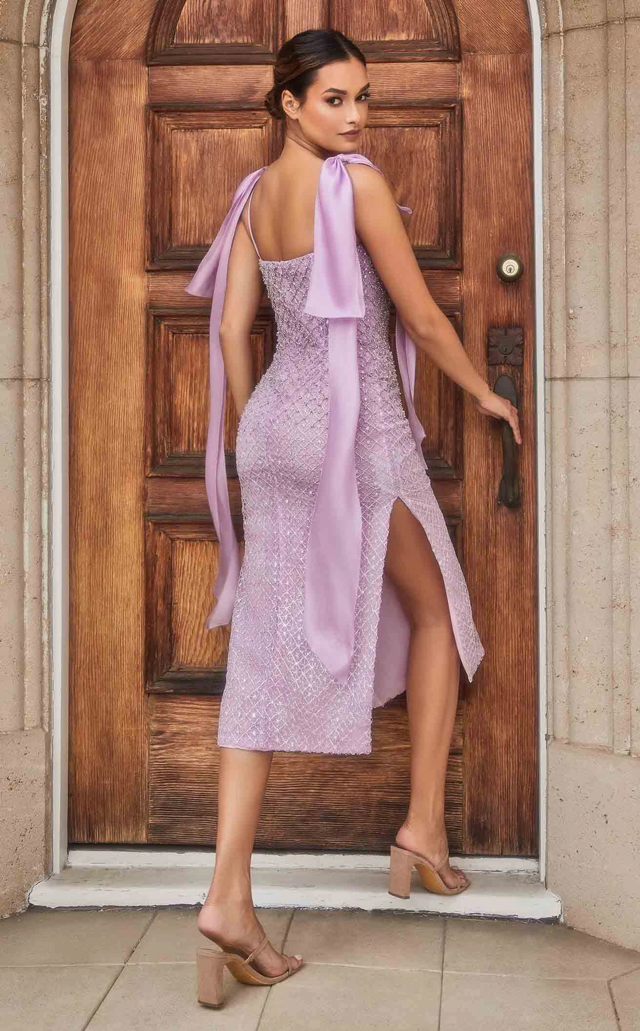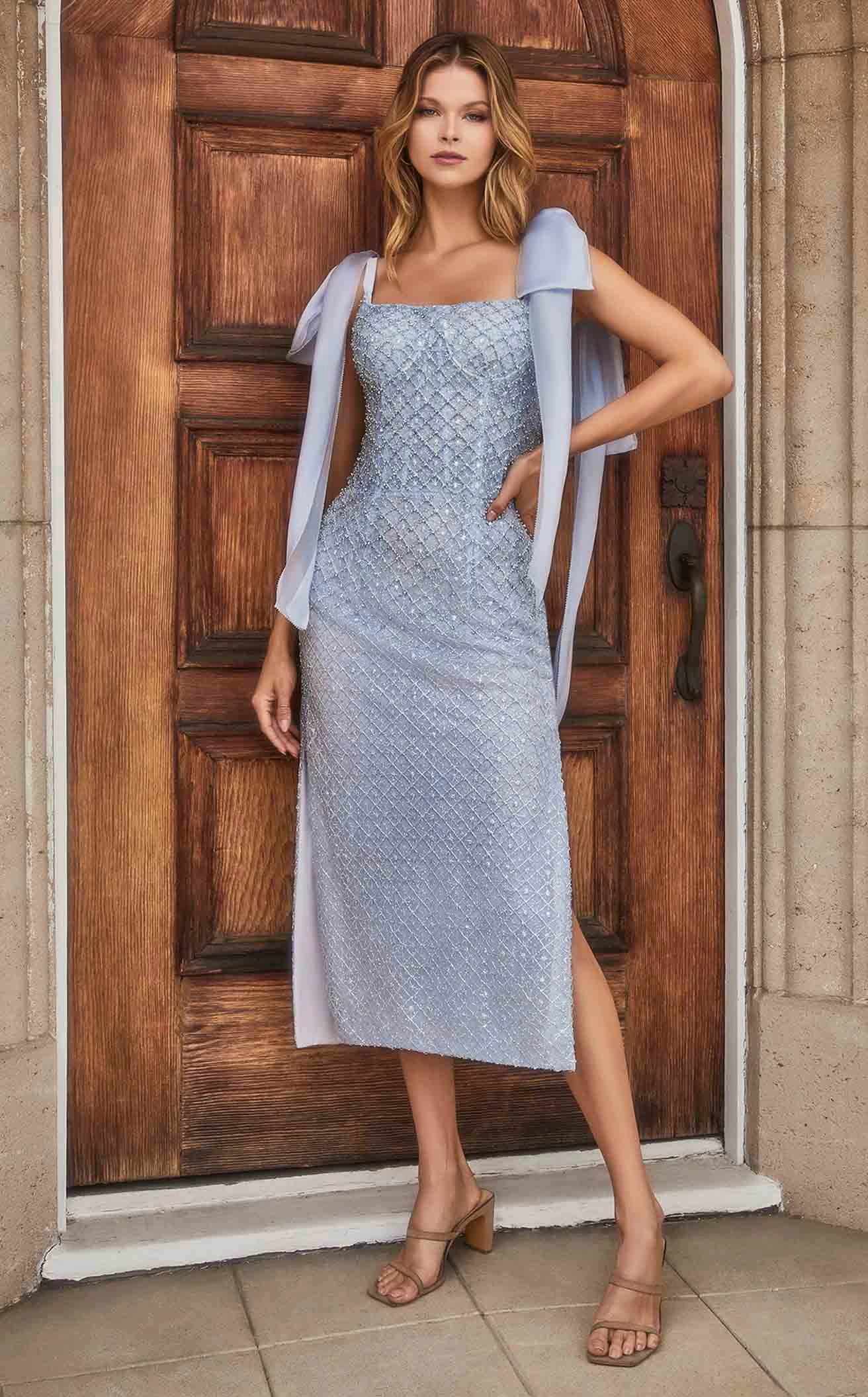 Step into the evening party with full credence in this gorgeous dress by Andrea and Leo. It comes with a square neckline. The fitted bodice features defined cups and boned lines to give that perfect posied look. The sleeveless design looks elegant with the presence of extended ribboned shoulder straps. The contoured waist follows a midi skirt with side slits.