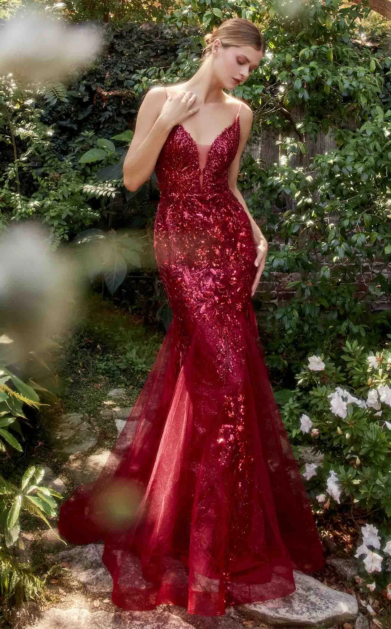 Embrace the shine and glamor with this gorgeous dress by Andrea and Leo A1118. It comes with a plunging mesh V-neckline. The skinny shoulder straps make it a sleeveless dress. With a natural waistline, the filled bodice follows a full-length skirt with a tulle trumpet cordon. The dress is embellished with glitters and intricate monochromatic patterns throughout.