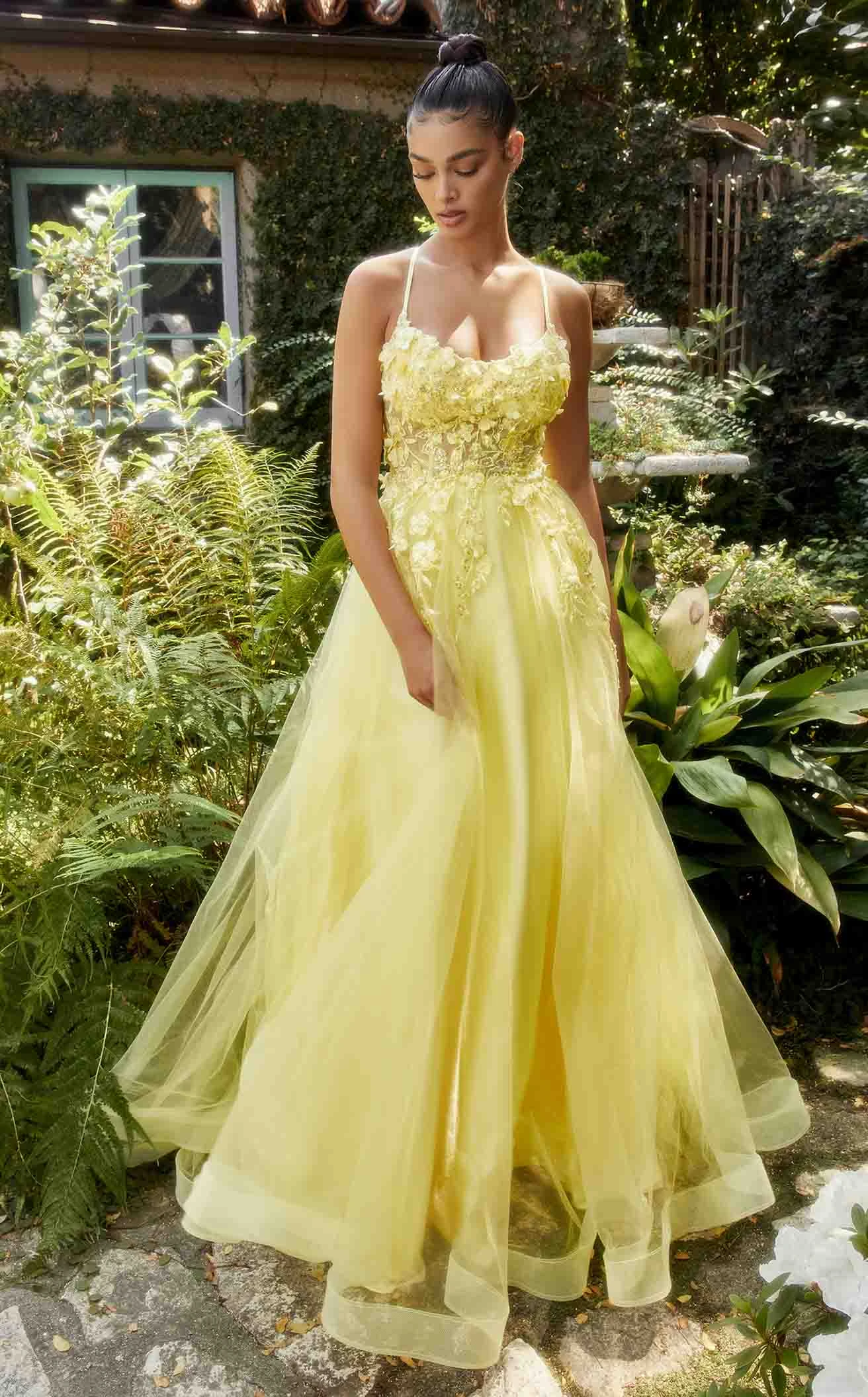 Slay the adorable barbie look with this gorgeous dress by Andrea and Leo. It has a scoop neckline and skinny shoulder straps that amplifies the sleeveless design. The fitted bodice is embellished with three-dimensional flowers and beads. It has a natural waistline that follows a full-length tulle skirt with a flowy silhouette.