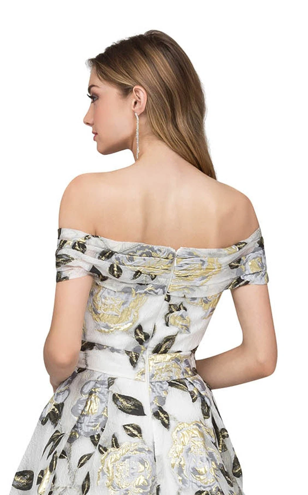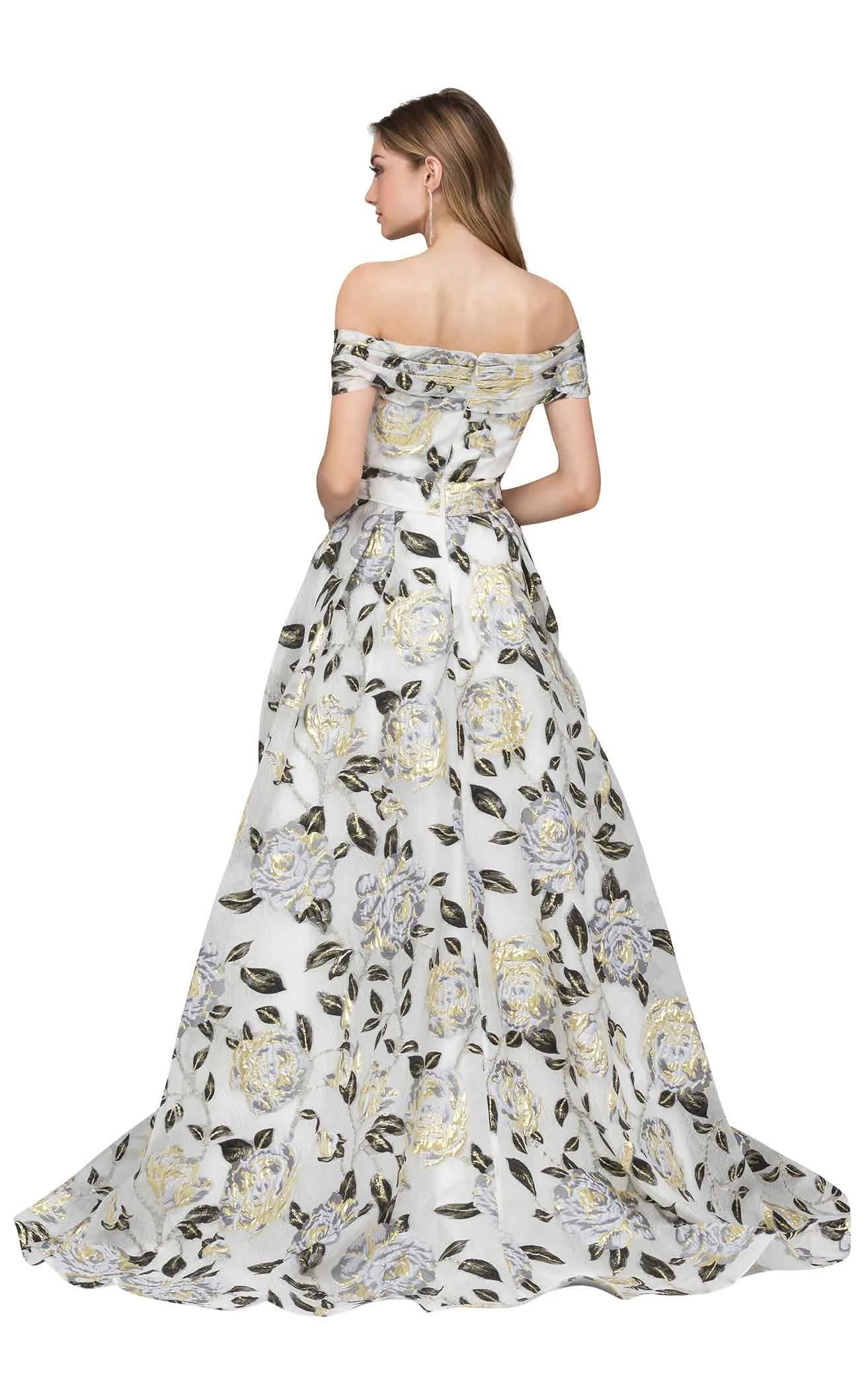 Charming floral off-the-shoulder evening gown from Cecilia CoutureGet admiration for your style quotient wearing this Cecilia Couture’s textured floral evening dress at a red-carpet event. The bodice features off-the-shoulder neckline with pleated straps gracing the upper arms while sheer split accents the center front. A tonal band defines the waist and the pleated full-length A-line skirt flares to the ballgown silhouette hem for a fabulous look.
