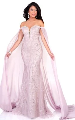 Fetch compliments all night in this stunner by Cecilia Couture 1520. It has an off-shoulder sweetheart neckline with a drape at the back. The dress is enveloped in glitter and floral appliques, making it a perfect choice for the red carpet-event. Its trumpet silhouette accentuates your curves nicely while the court train adds a bit of drama.