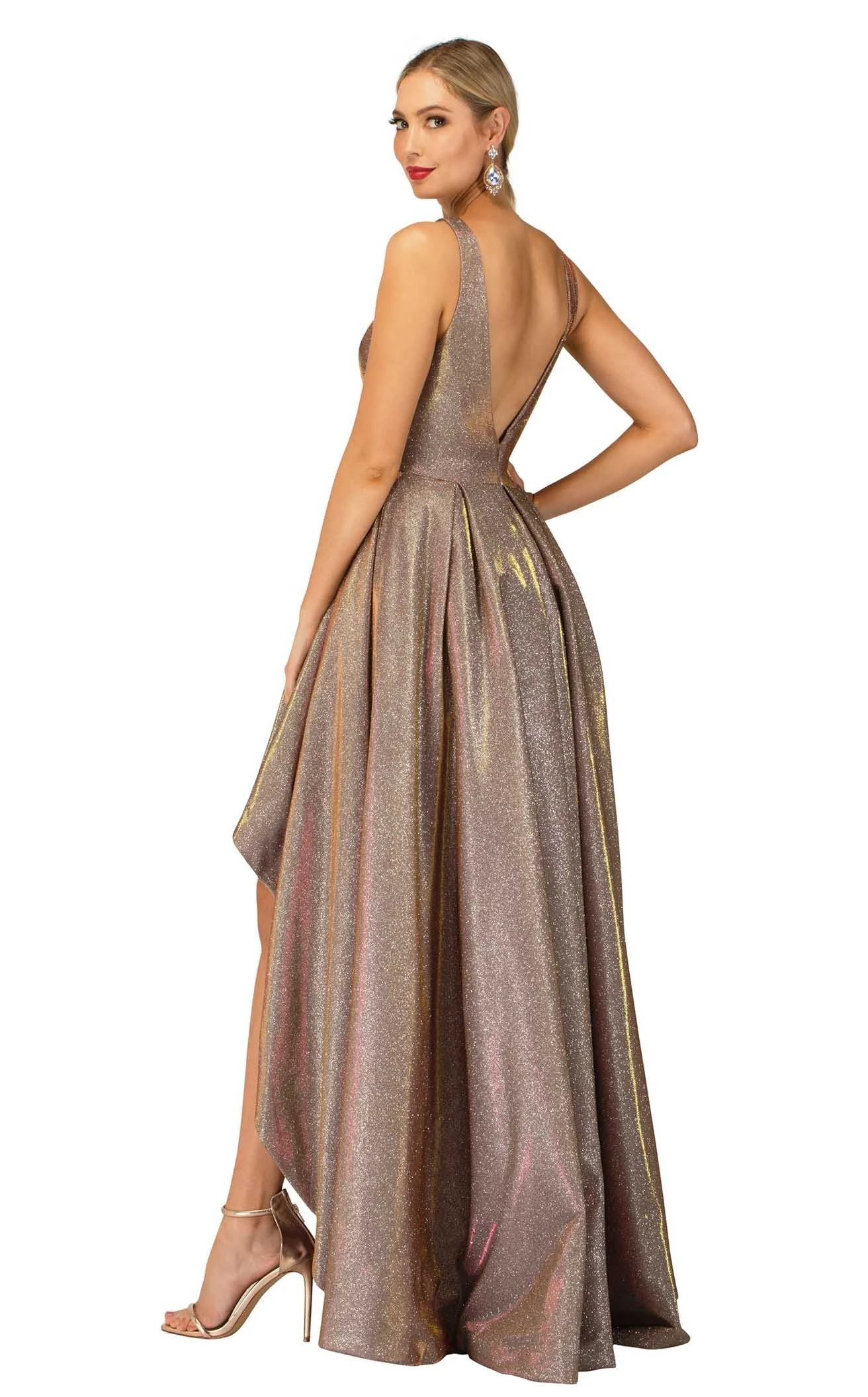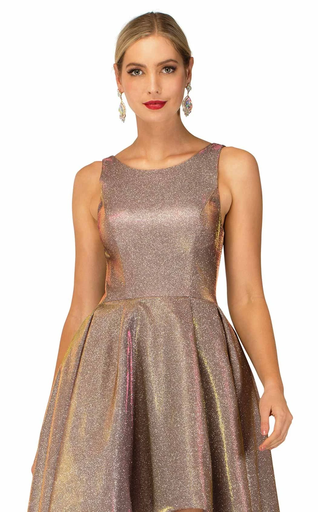 Waltz the night away in this glittering A-line gown designed by Cecilia Couture 2122. Graced in a fitted sleeveless bodice, the dress shows off a high scooped neckline. Cinched at the waist, the glittery A-line skirt displays a high-low hemline highlighting your legs and creating drama at the back as you make your entrance.