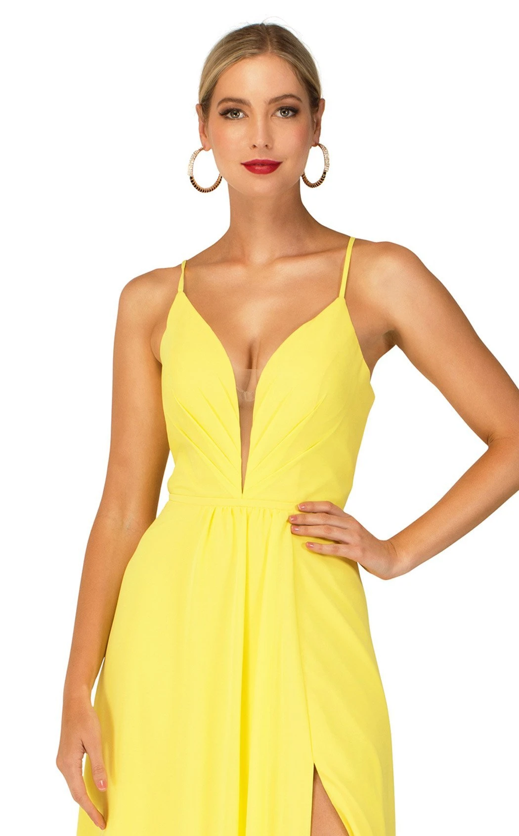 Strike a pose as you enter the room in this exquisite look from Cecilia Couture 2123 dress. The sleeveless bodice displays a plunged V-neckline with sheer inset and ruched detail to catch attention. This dress has a slim waistband and transforms into a subtle A-line silhouette that flows elegantly to the floor-length revealing a thigh-high side slit.