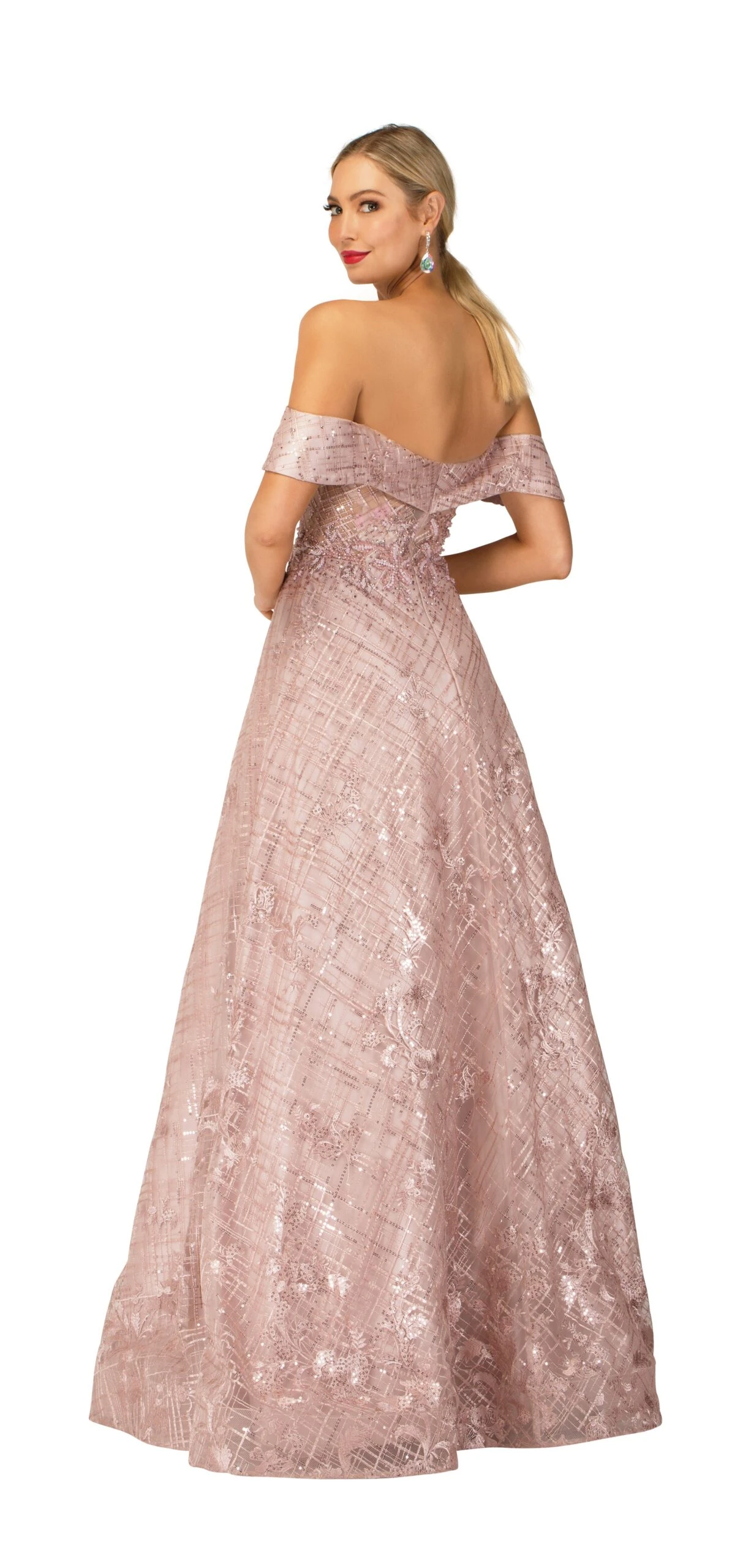 Infuse your special event with stellar style in this strikingly beautiful gown by Cecilia Couture 2169 that is adorned with sparkling sequins and bead embellishment throughout. The fitted illusion bodice has off-shoulder draped cap sleeves complemented with boning structure below the bust for a fantastic fit. The A-line silhouette skirt flows down to the full-length hem with sweep train.