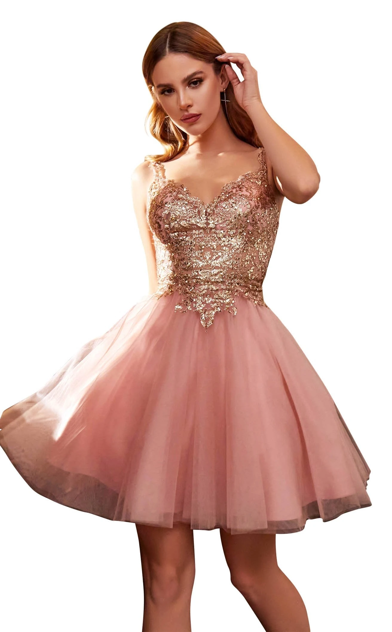 Look absolutely lovely in Cinderella Divine 9239 Dress. This stunning piece features a a-line silhouette and glittering accents. The sleeveless bodice has a v-neck neckline and a natural waist.