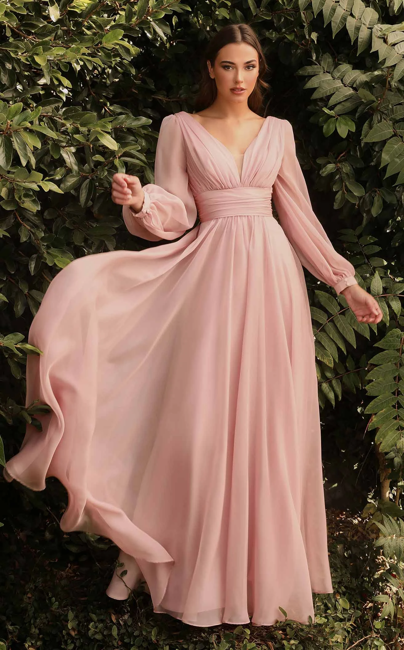 Stun everyone as you walk wearing this glowing dress by Cinderella Divine CD0192. It has a deep V-neck with bishop sleeves and zippered back. The pleated bodice features a mirrored midriff that accentuates your curves. It has an A-line skirt that flows into the air and creates soft pleats with a sweep train.