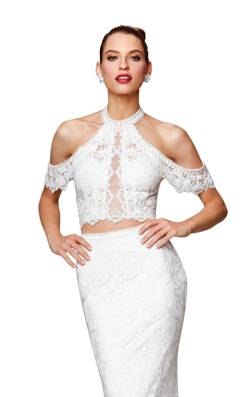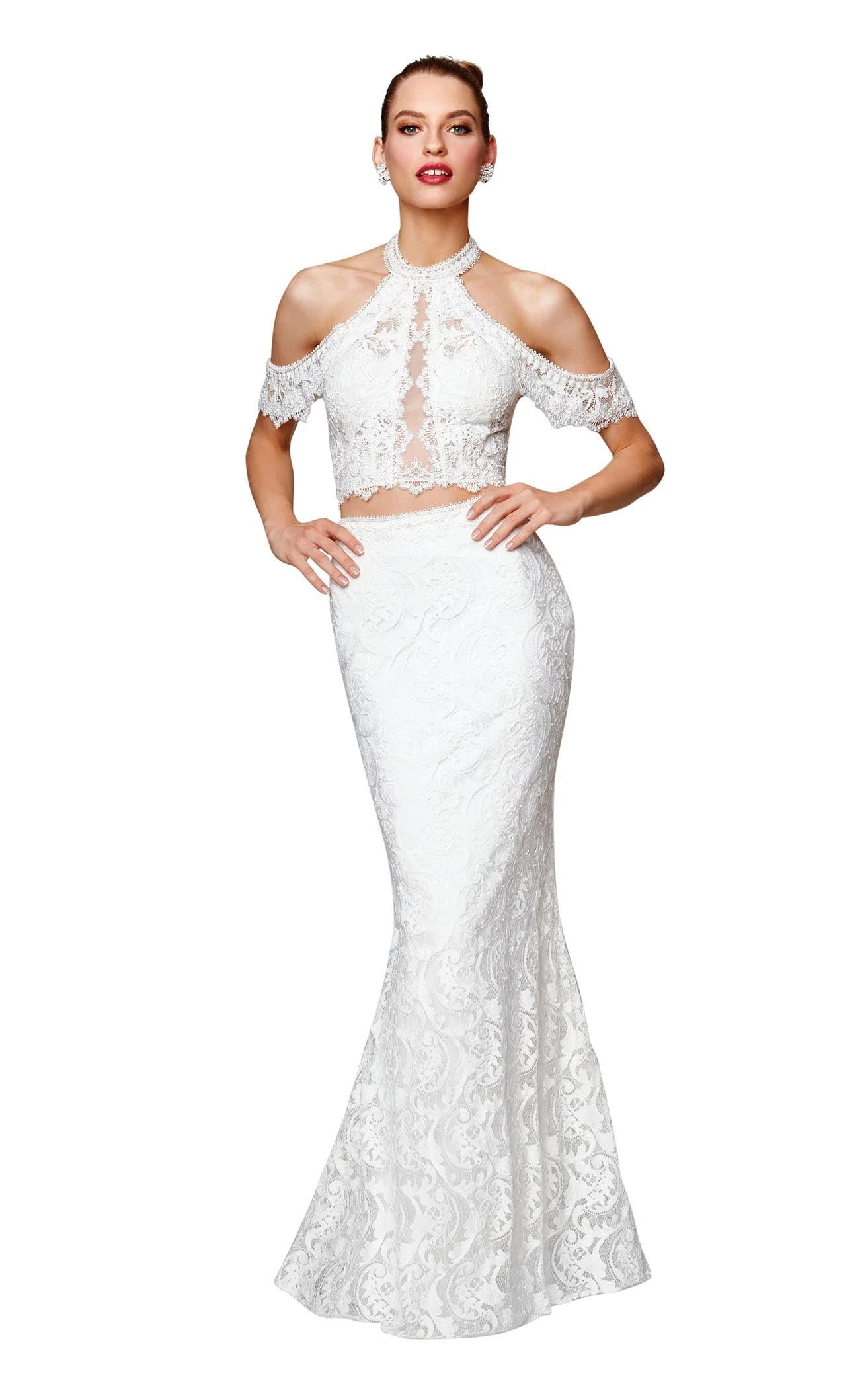 Splendid two-piece gown with cold shoulders and open back by ClarisseLeave a lasting impressing wearing this magnifiqué gown by Clarisse to the next party. Its two-piece trumpet silhouette features a halter neck bodice with elaborate cold shoulders and open back. A full-length skirt flourishes from the waist and flares midway into a subtly flared trumpet end. A mini train finishes off the design of this elegant gown.