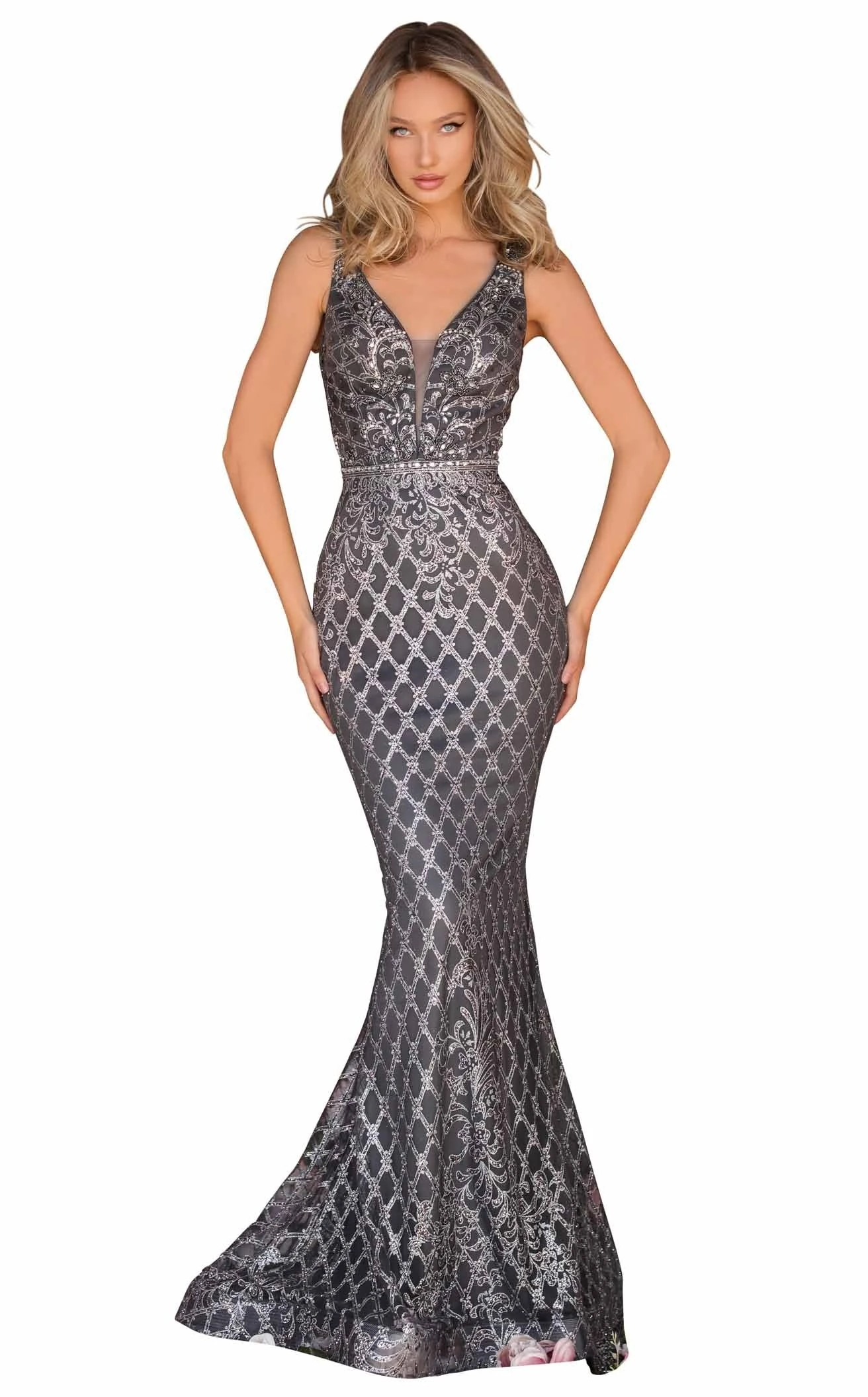 This shiny and shimmery dress from the house of Clarisse matches well with your modern style statement. An overall bead and stone embellishment in an exquisite pattern looks beautiful. The fitted bodice has a V-neckline with mesh insert and an open back. This dress has a trumpet silhouette skirt with horsehair hem, floor-length and a sweeping train.
