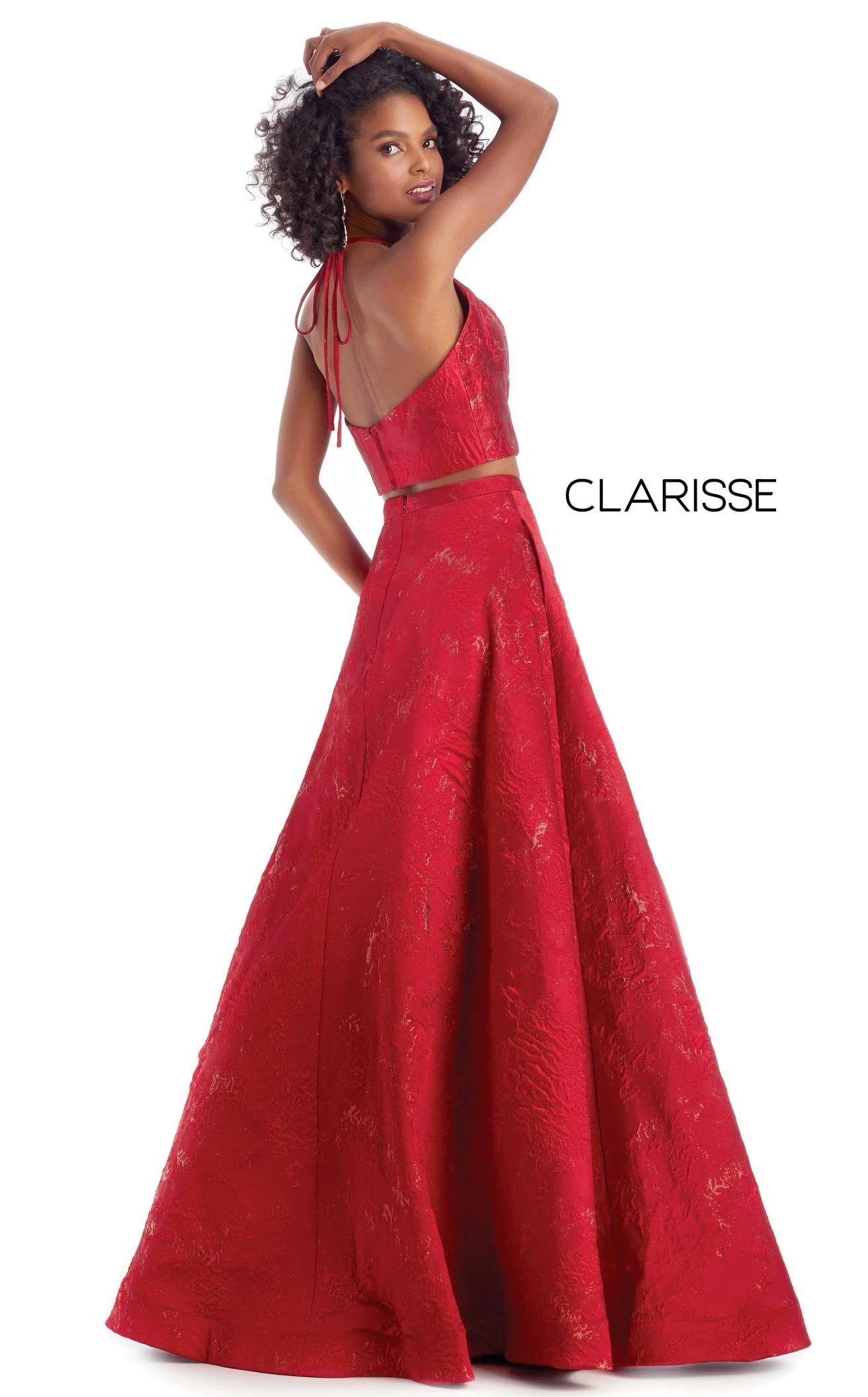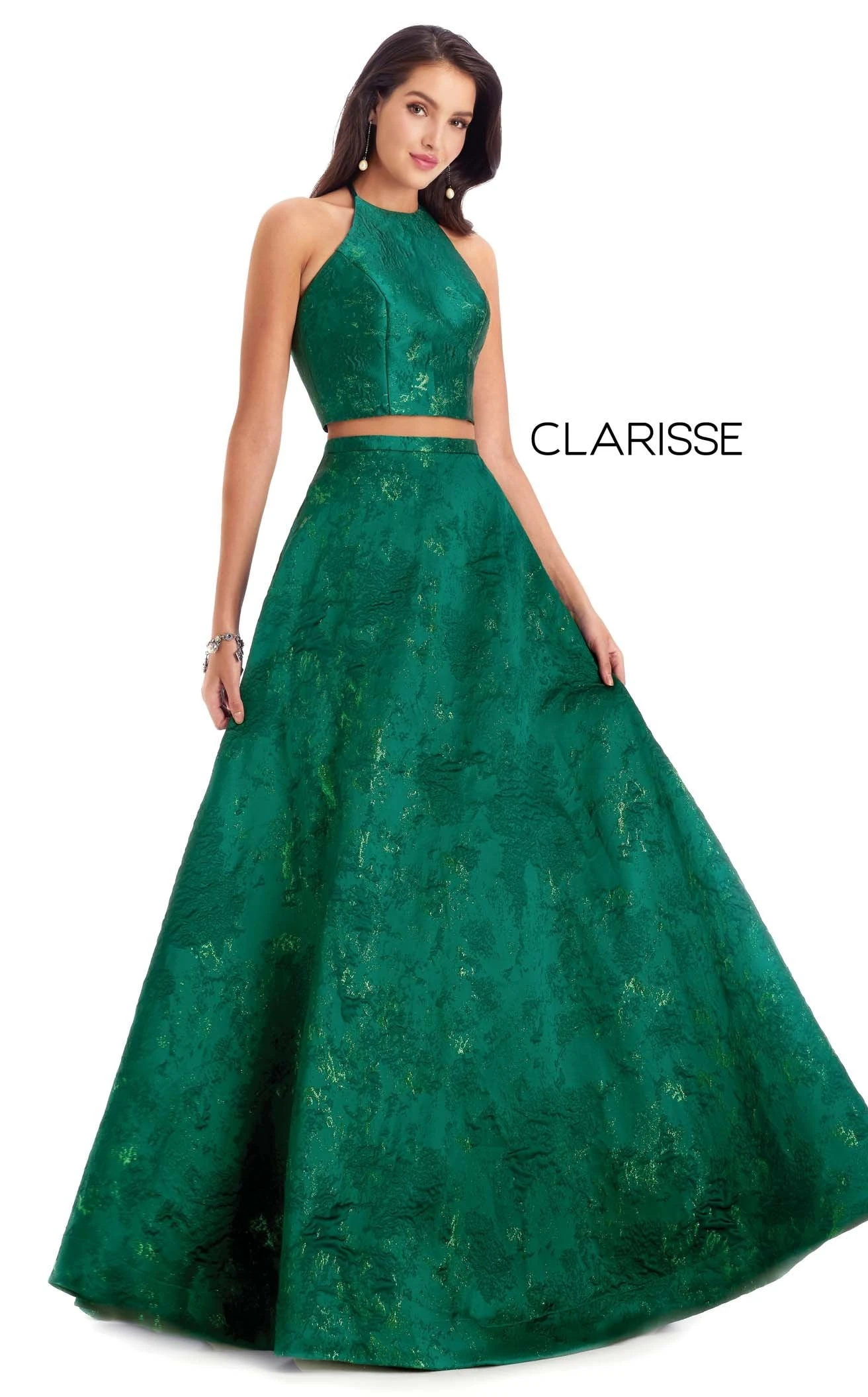 Showcasing a flash of urban appeal, this lovely creation by Clarisse looks chic and elegant. Designed to give you a diva appeal, this exquisite two-piece dress has a crop top with a halter neckline and an open back. The overall glitter detailing in an intricate pattern makes this dress fashionable. This A-line silhouette skirt cascades to the full-length hemline.