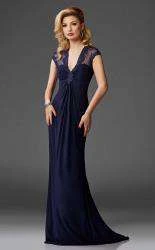 Put a fine point on formal in this pretty peignoir-style evening gown by Clarisse M6412. Lovely lace trims the sheer cap sleeves and deep V-neckline. A shimmering applique draws up gathers from bust, midriff and waist to create a tuck-tailored fit at bodice and skirt. A fetching flute accents the fluid skirt as it floats to a trailing full-length.