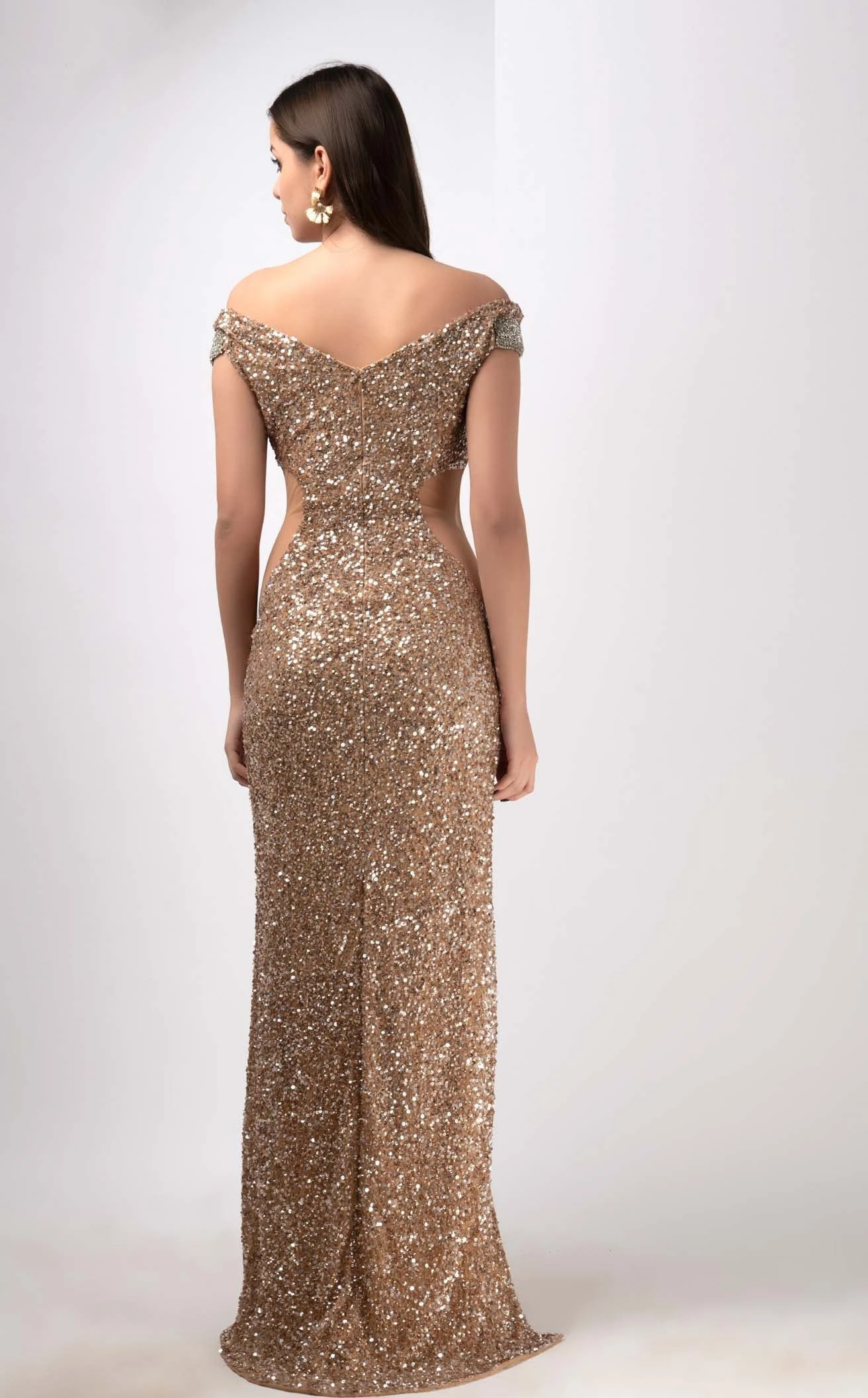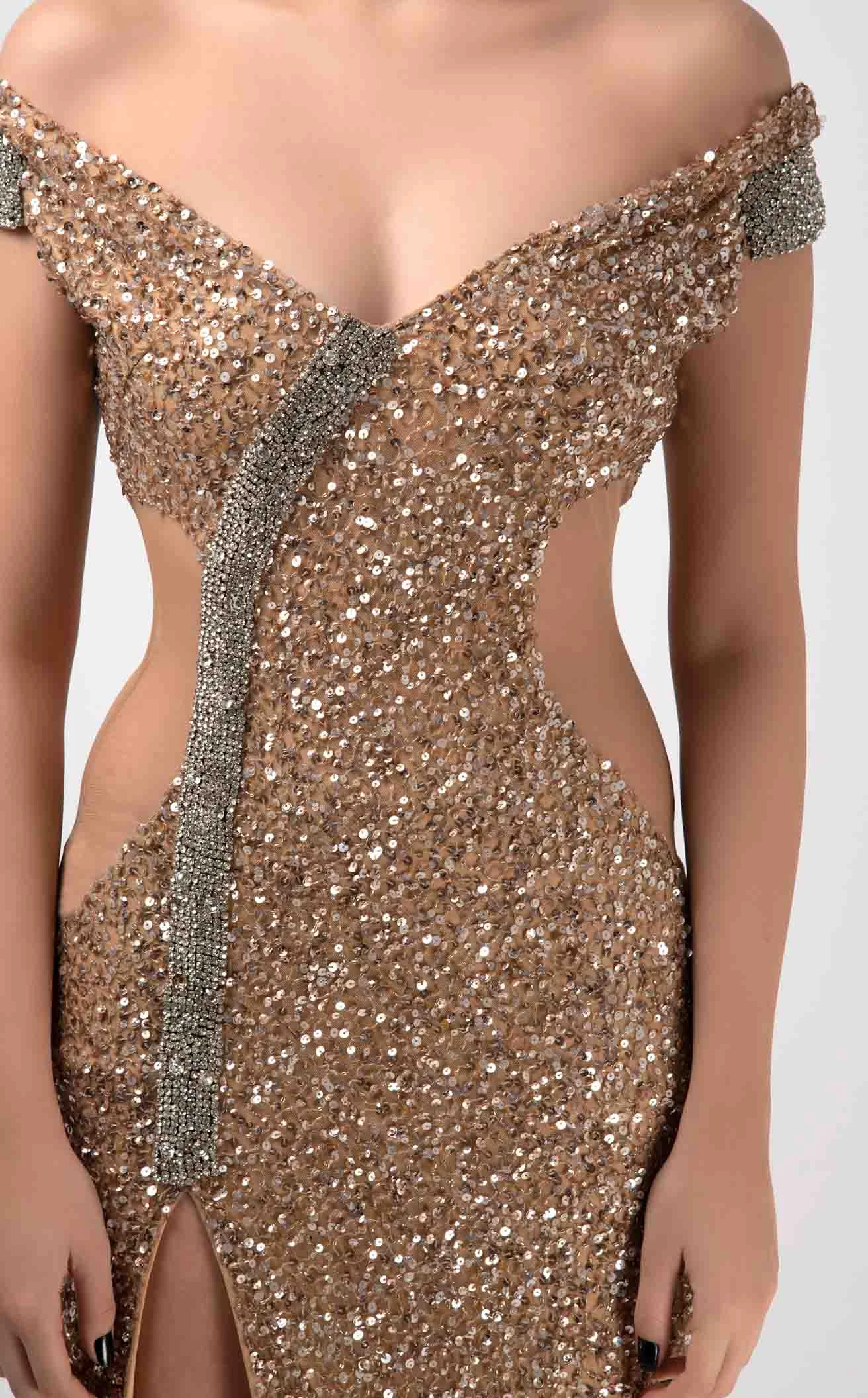 Dazzle in an evening full of elegance and extravagant panache with this fabulous dress from Couture Fashion by FG. The two-toned off-shoulder dress has a plunging V-neckline that sits over a fitted bodice with an illusion waistline. Extending from the waist to the floor is the sheath silhouette dress with a seductive slit to show off your legs. Adorned entirely with glitters, this dress looks magical.