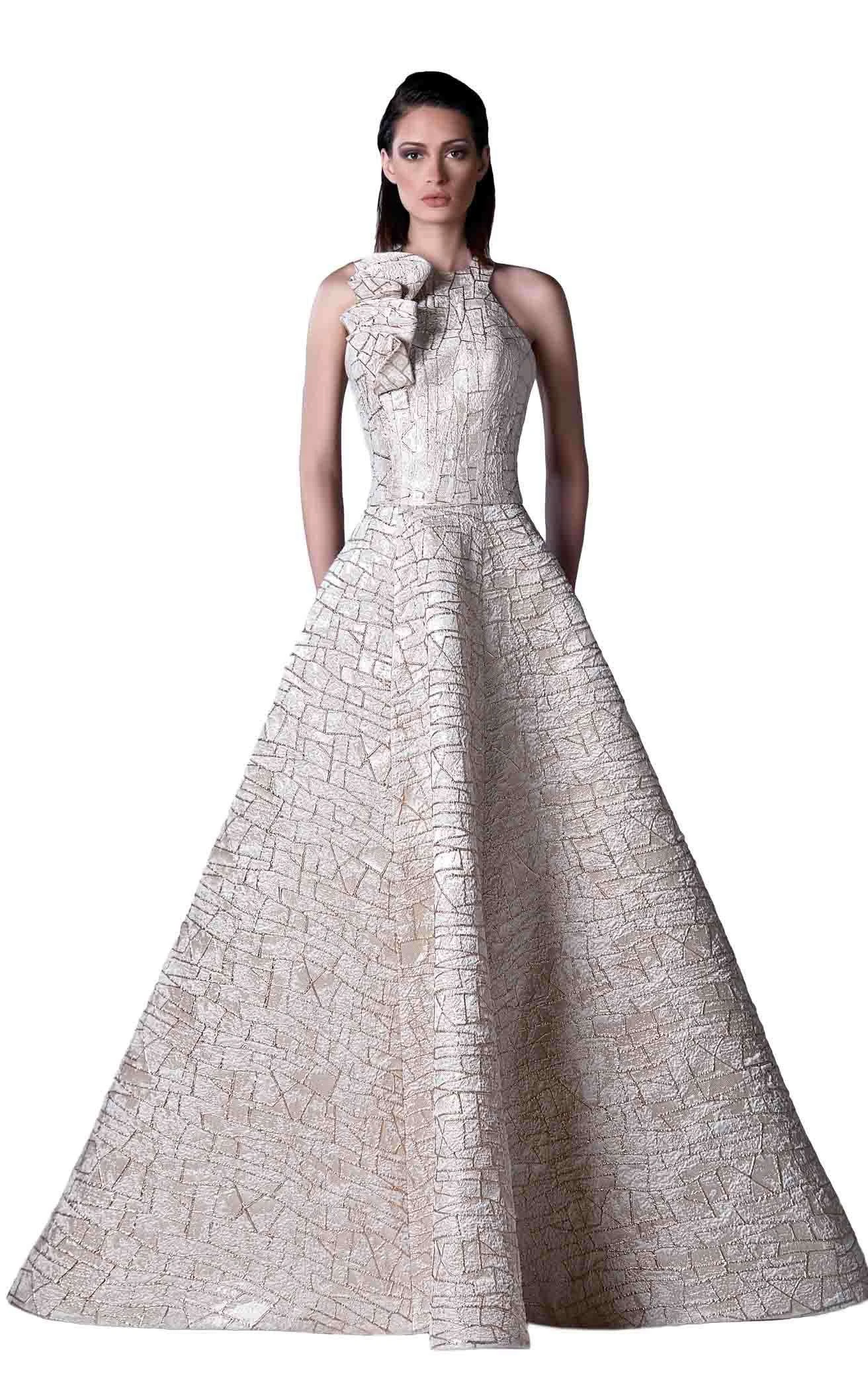 Dress to impress in this smashing evening gown by Edward Arsouni Couture. The halter bodice features a jewel neckline and a self-fabric bow accent at one shoulder. The sculpted design draws a custom-style fit along the bust and midriff. The bias-cut skirt flares from the trim waist to a full, fluttery hemline at the feet.