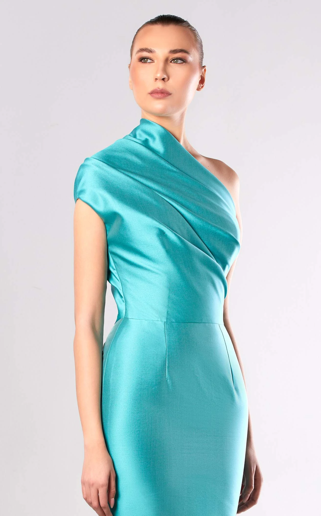 Look absolutely superb in Edward Arsouni Couture FW664 Dress. This exquisite piece features a column silhouette and simply chic. The short sleeve bodice has a asymmetrical neckline and a natural waist.
