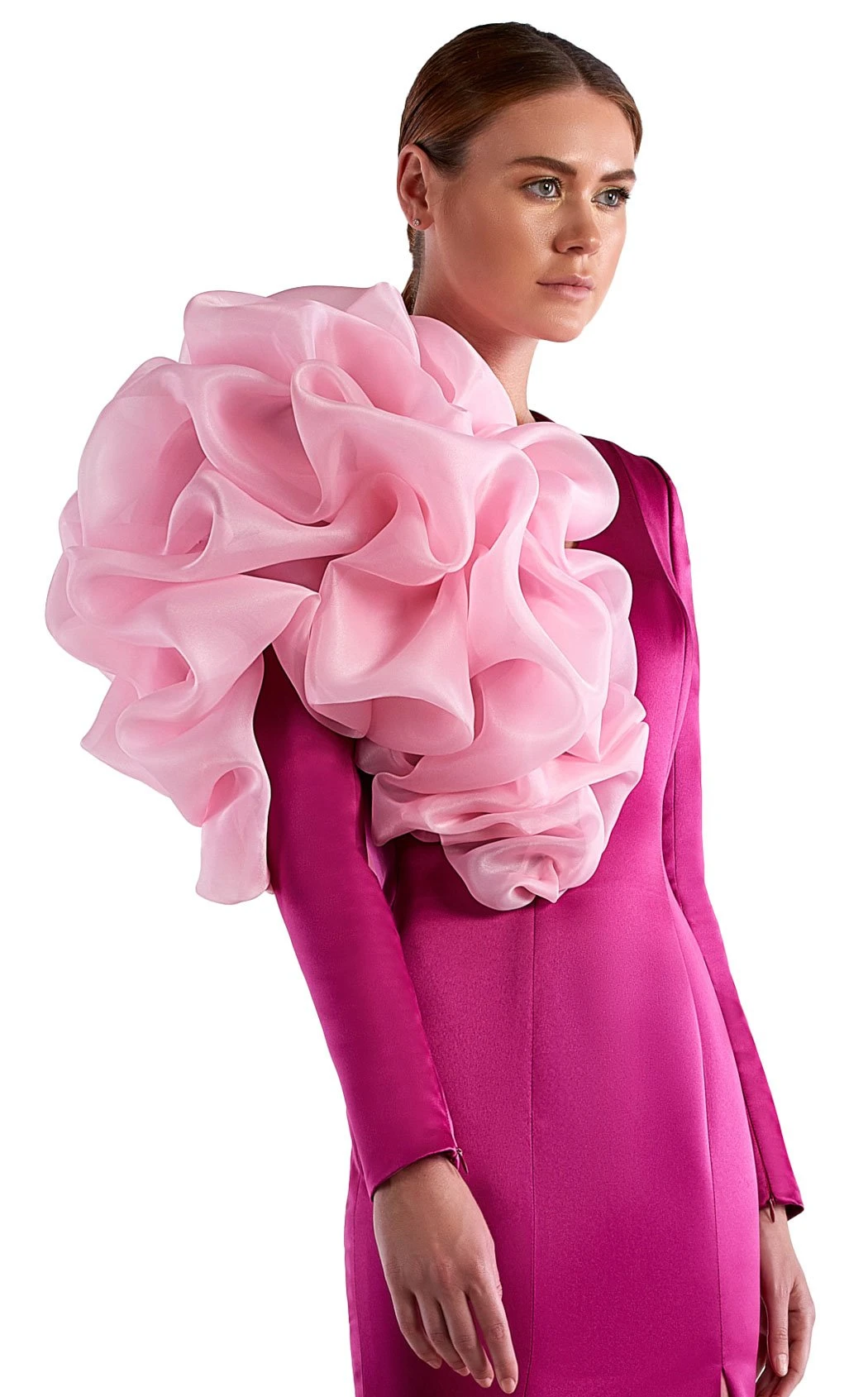 Catch the spotlight and you’ll surely be the center of attention in this Edward Arsouni Couture gown. The dress is designed with a fitted bodice that has a high neckline and long sleeve. The ruffled oversized floral appliqué along the shoulder adds a glamorous appeal to it. The long skirt reaches floor-length hemline with a thigh-high slit.