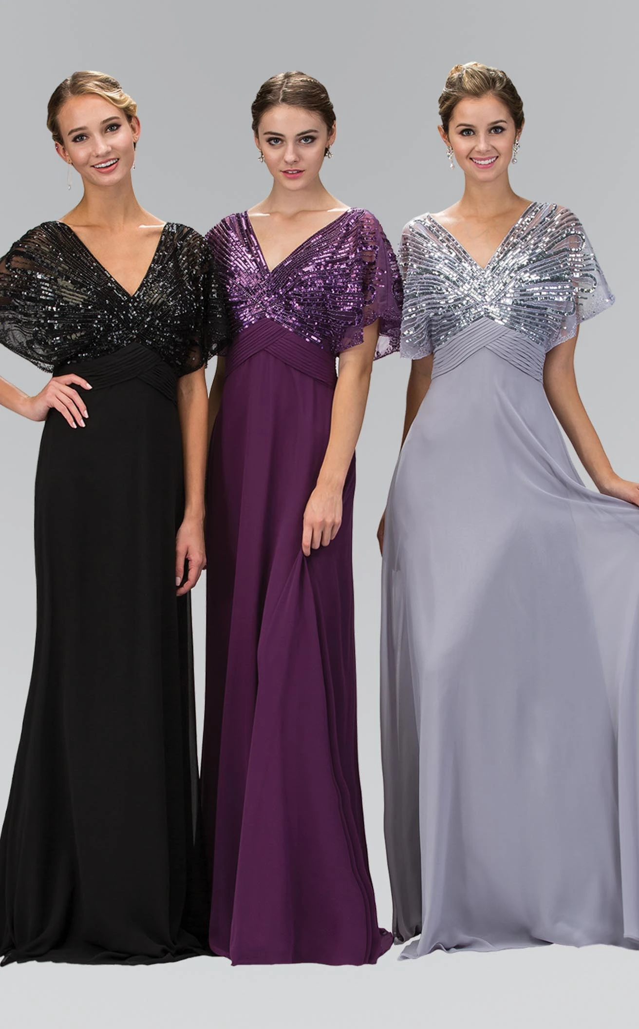 Dress up like a goddess in this beautiful evening dress from the house of Elizabeth K GL1145. It has a sequin bodice with V-neckline and kimono sleeves. The main catch is the cinched midriff and flowing skirt that follows it. This dress has an A-line silhouette that accentuates your natural curves and gives a defined look.