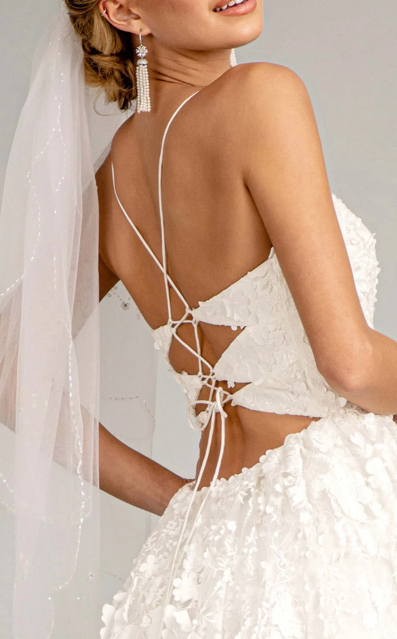 Find the beauty in wearing something as pretty as this dress designed by Elizabeth K GL1985. The bridal gown looks enchanting with its beauty scoop neckline and strappy floor-length design. The classic A-line silhouette along with the veil make it an absolute simple, elegant, and gorgeous bridal wear you just can’t resist.