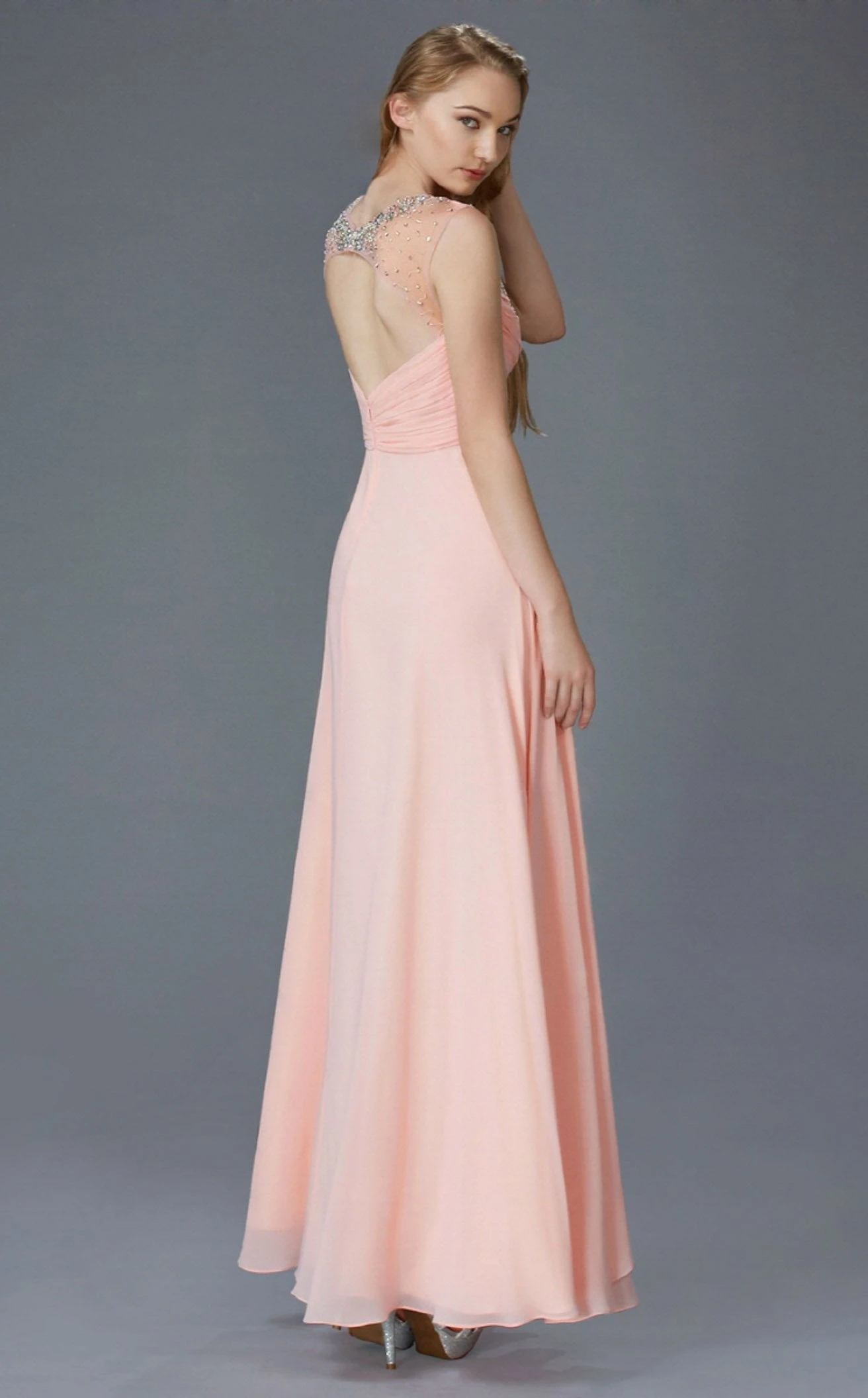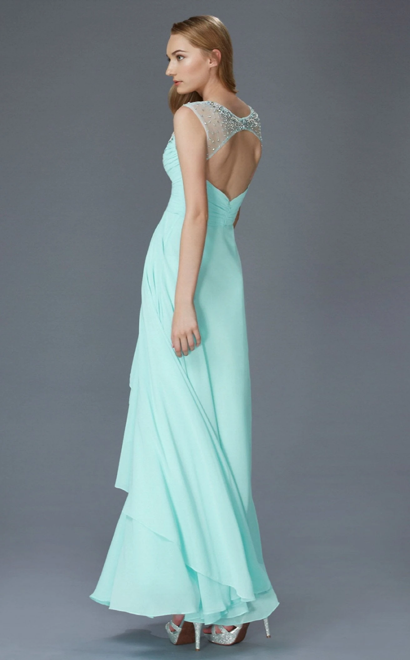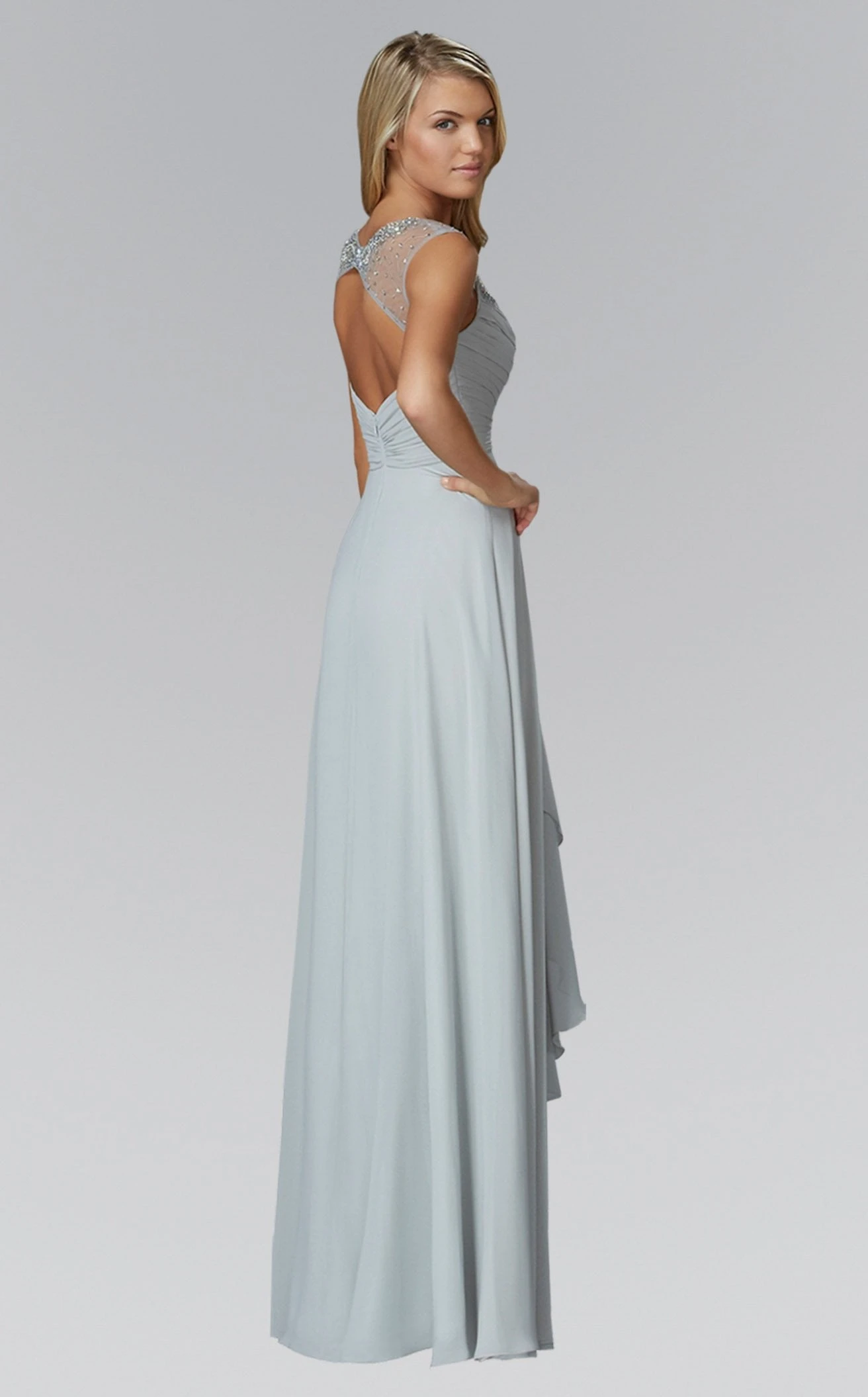Define your moment at the next event with this gorgeous and graceful long dress designed by Elizabeth K GL2023. Beautifully sculpted with luminous beads around the plunging neckline, the strappy bodice includes condensed ruched details all over. The flare of the A-line silhouette reveals glamorous cascading layers complemented by front pleated patterns.