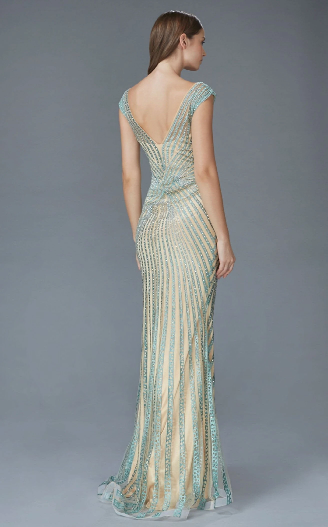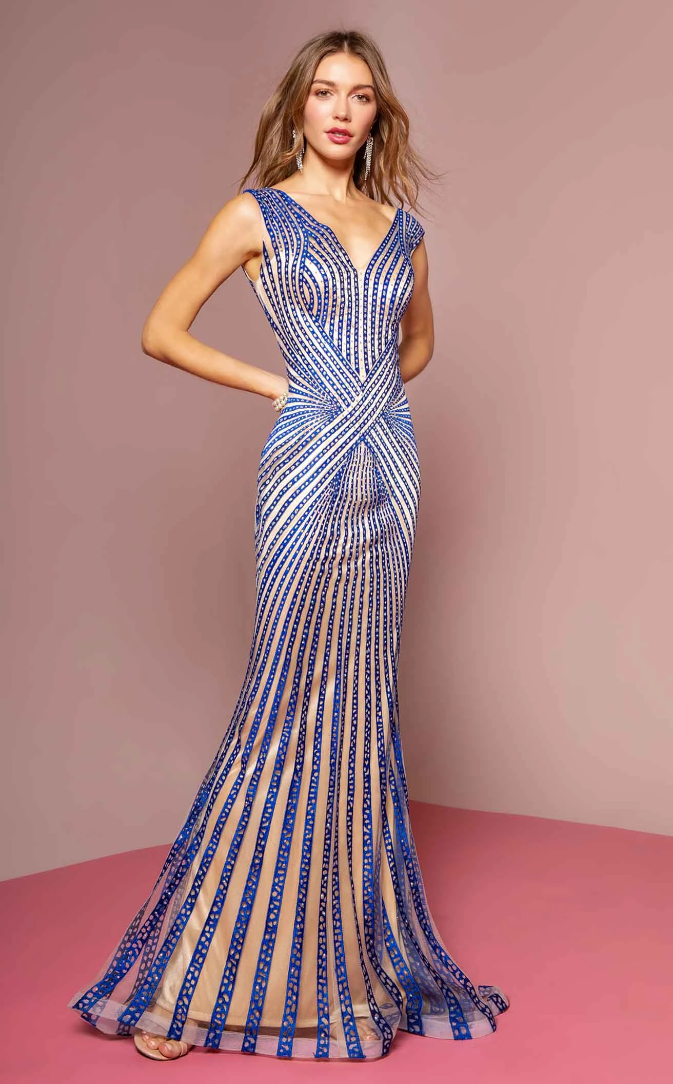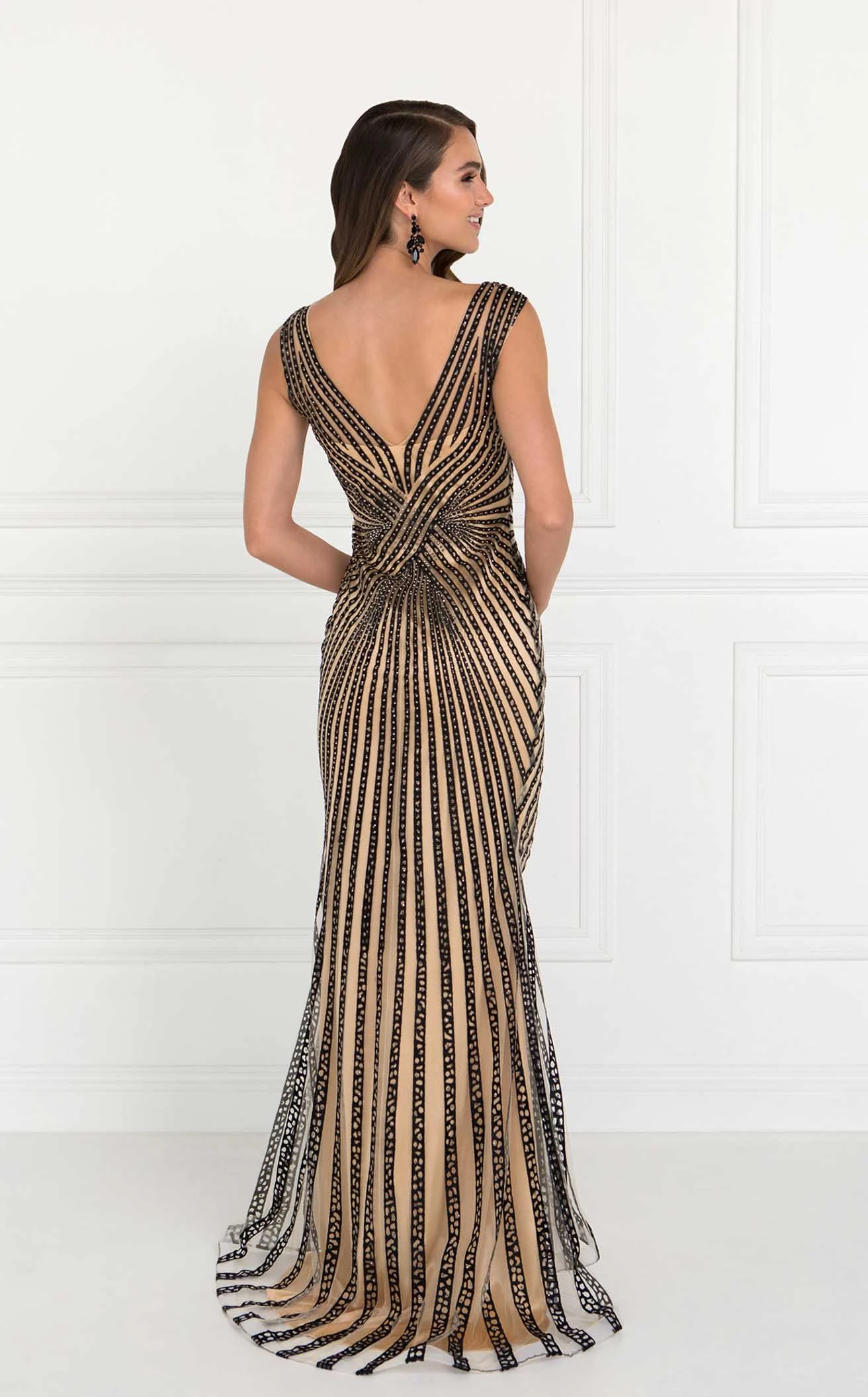 The trumpet silhouetted floor-length dress by Elizabeth K GL2053 is unique and fascinating. The embroidered lines and rhinestone embellishments form a striped design with a cross in the middle. The fitted bodice features a V neck and an open V back with a zipper. The sleeveless dress is perfect for galas and parties and accentuated the curves and features.