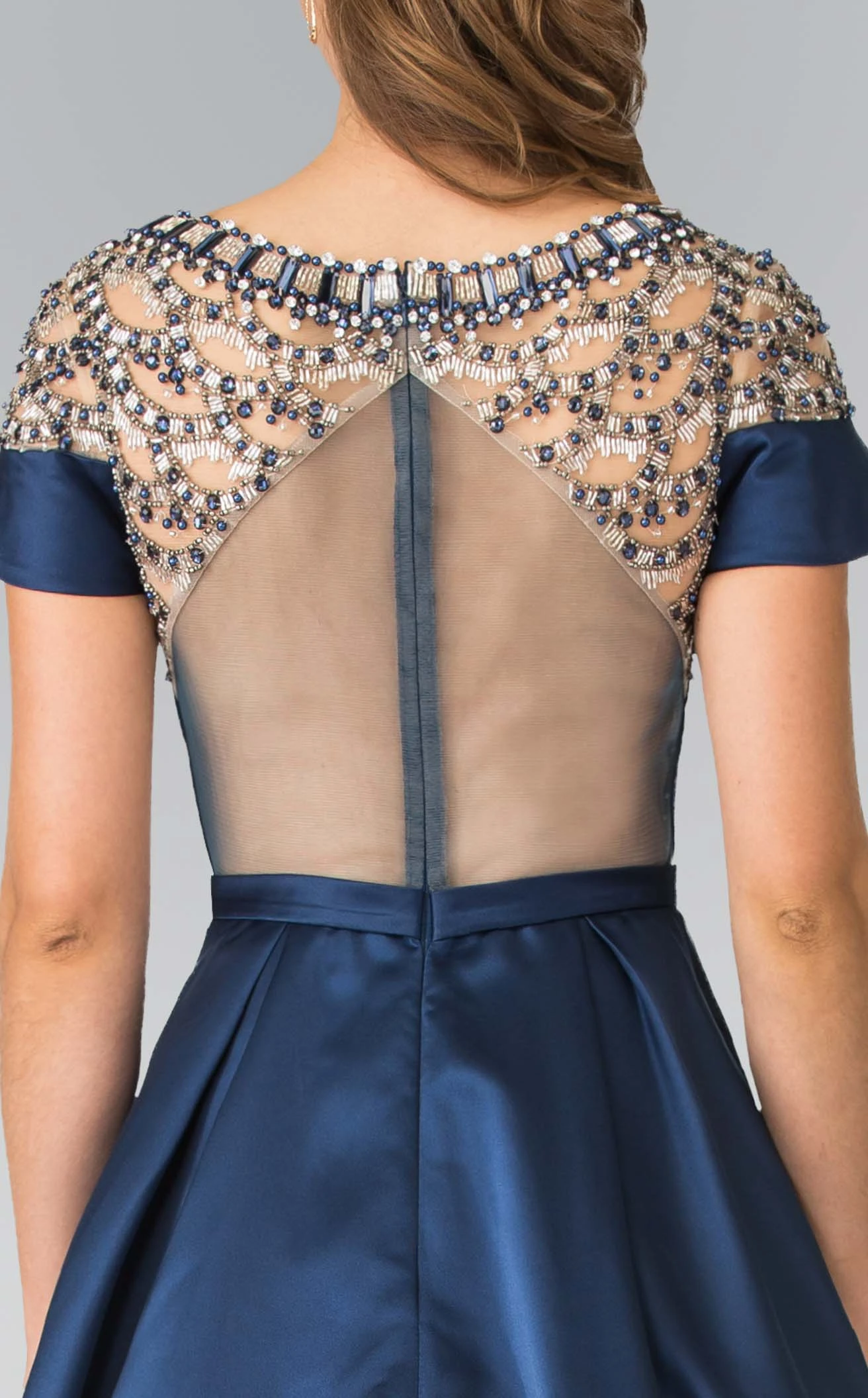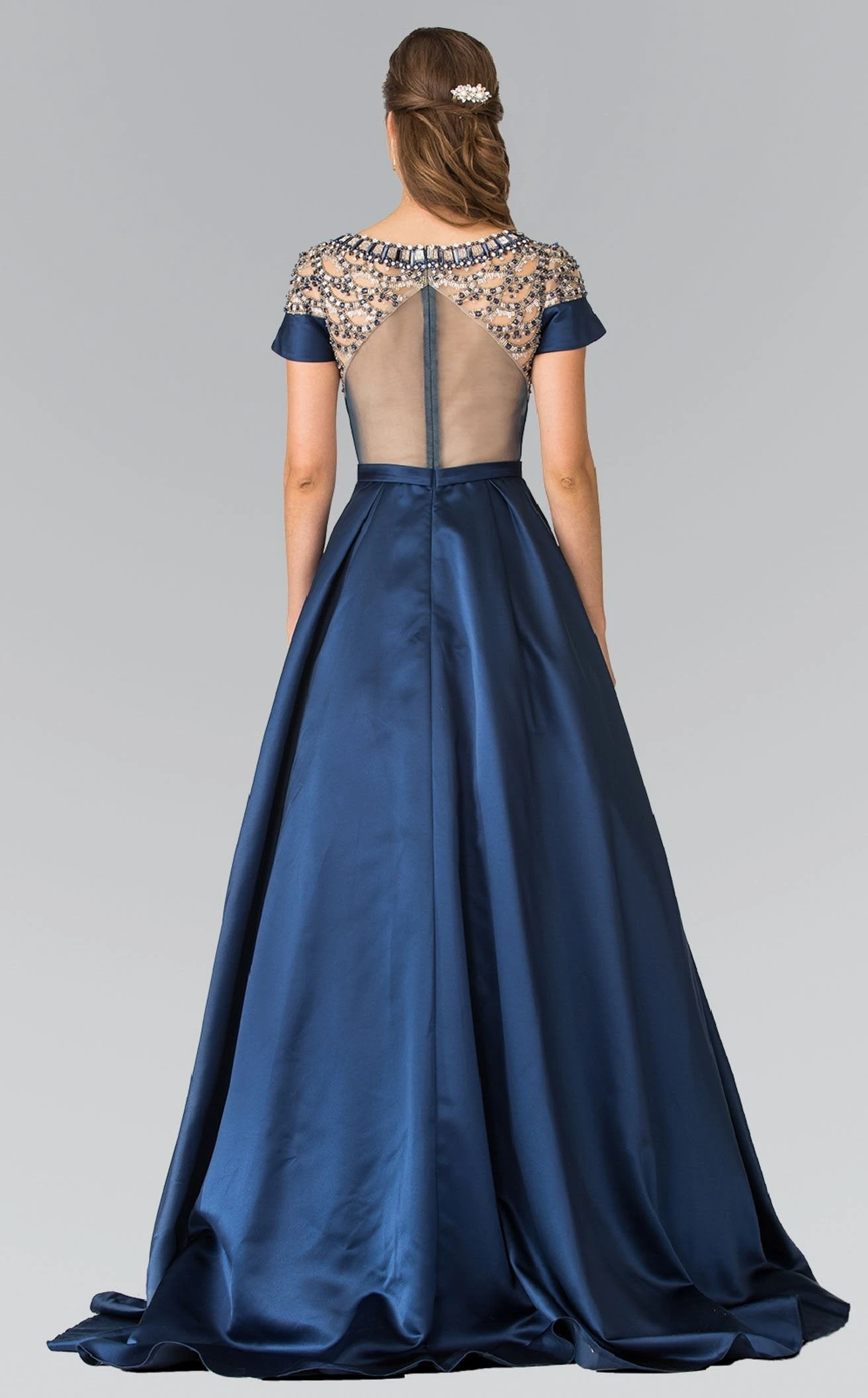 Glamour gets gorgeous in this extraordinary long dress designed by Elizabeth K GL2215. This stunning ensemble showcases beautiful bead embellishments adorning the fold-over neckline. The empire gown is cinched right below the bust, from where the spacious skirt descends to the floor-length hem, revealing intricate pleats. A perfect pick for your next event!