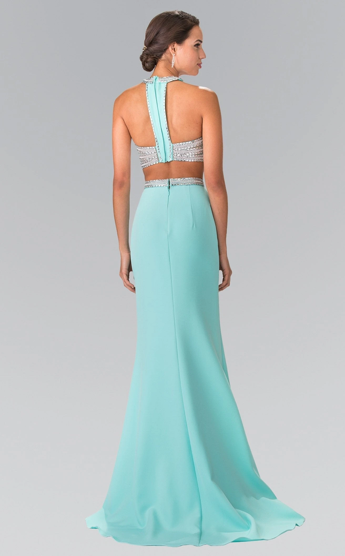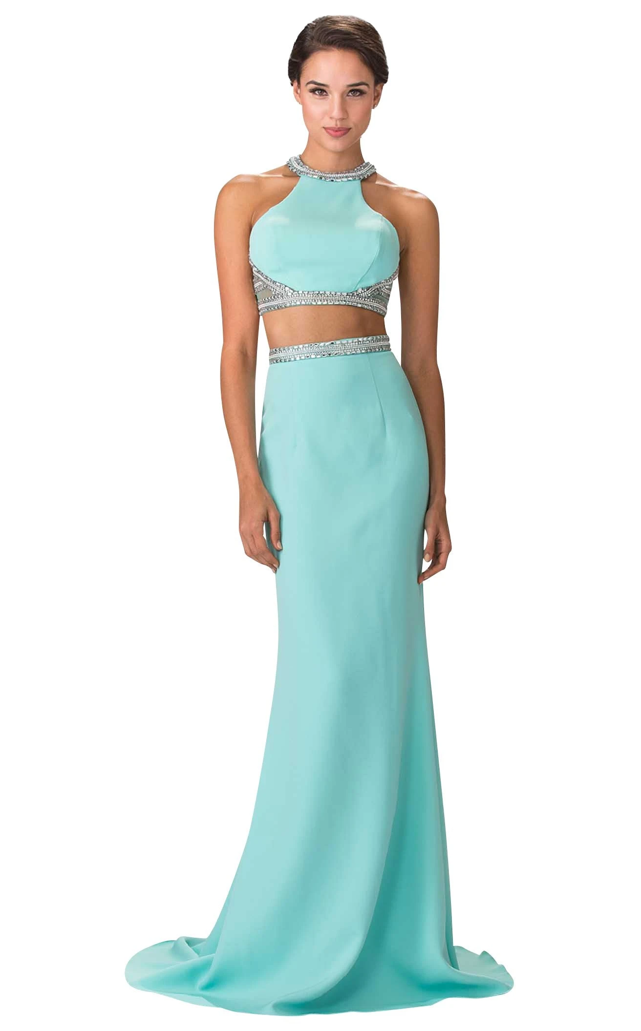 Dance away the night in this stunning two-piece gown tailored by Elizabeth K GL2256. Flaunting a sleeveless, halter neck crop top, the dress is meticulously sequined with glittery beads and laces, bordering the neckline, bust, and waistline. The skirt descends to the floor and forms a small train, bringing the best of a trumpet silhouette.