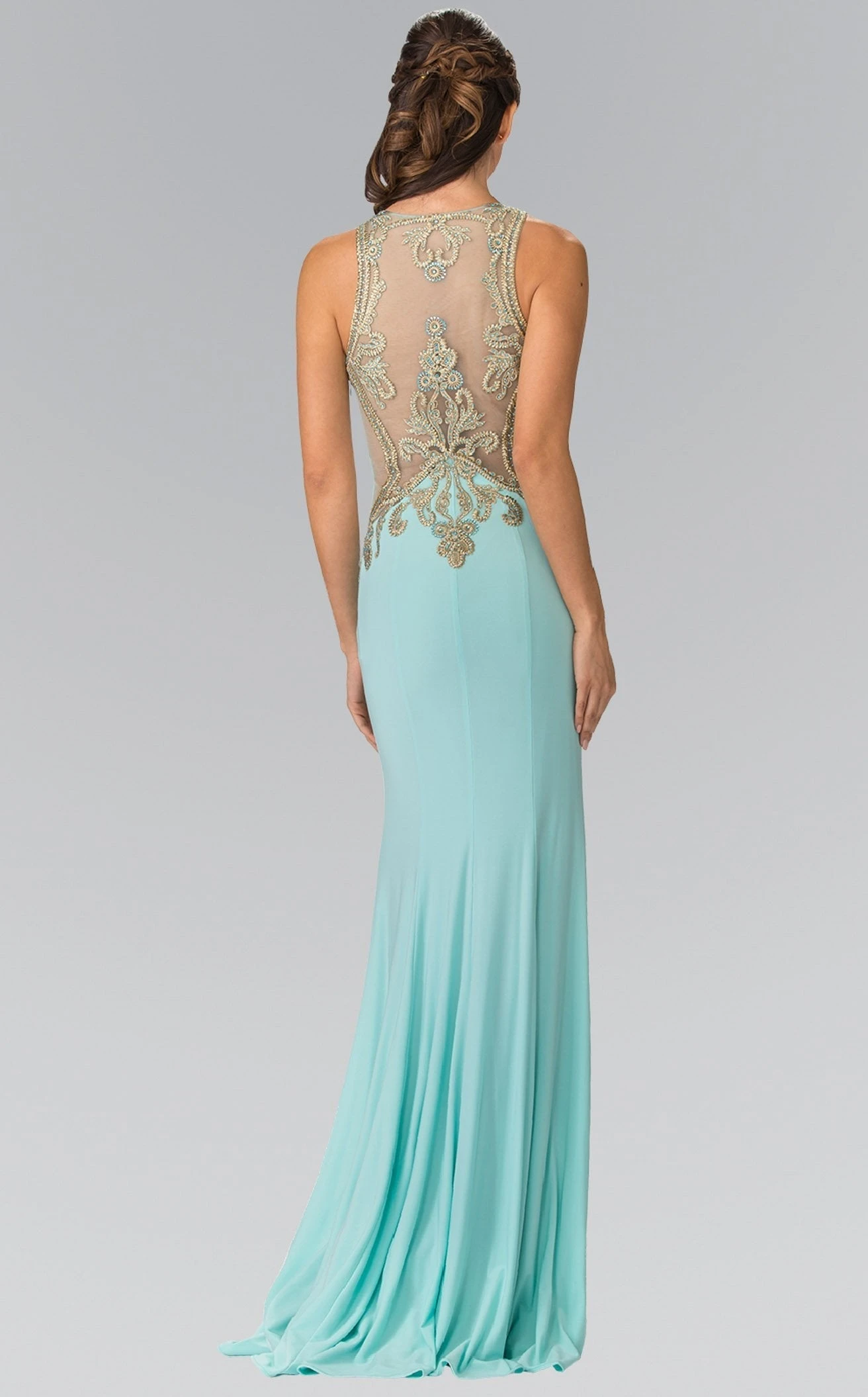 Channel your romantic vibes with a dose of grace wearing this lavishly designed dress from Elizabeth K GL2321. Strikingly featuring beautiful jewel trim embellishments, the dress flourishes the classic trumpet silhouette. The skirt opens from the knee and runs to the full-length hemline, showcasing intricate pleats. The sleeveless beauty gets its allure from the illusion neckline and the twin side cutouts at the midriff.