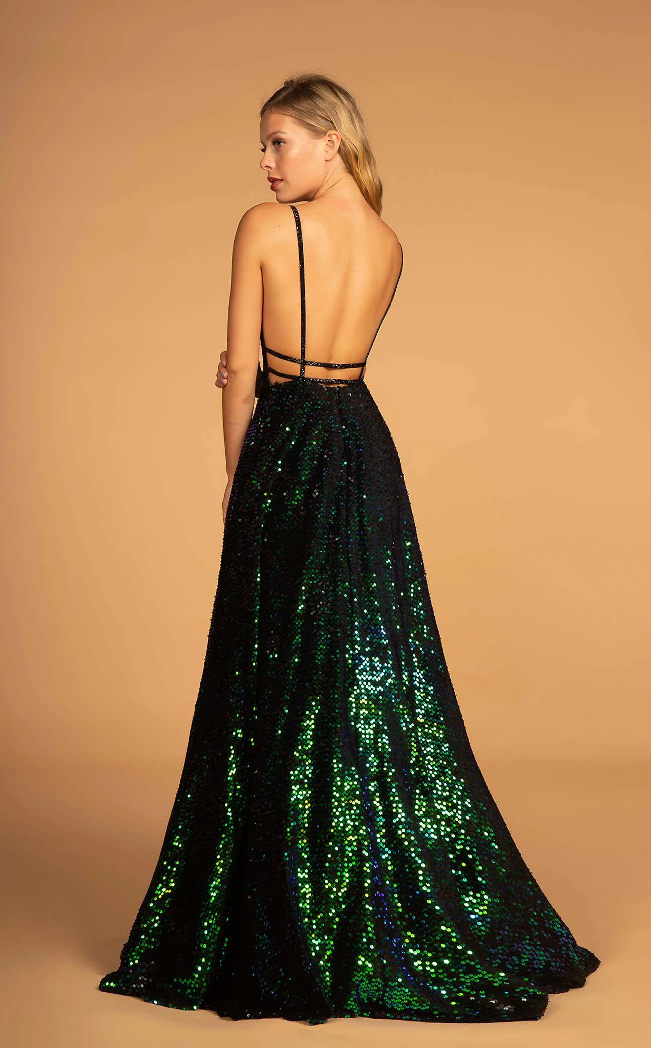 Flatter the crowd with the ball gown dress designed by Elizabeth K GL2581. The long dress has a fitted bodice with an illusion V-neck and spaghetti straps that extend to the back. The open back has a strap on either side and a double waist belt. Adorned with sequin embellishments the dress looks lustrous and has a flowy skirt that enhances the style and looks.
