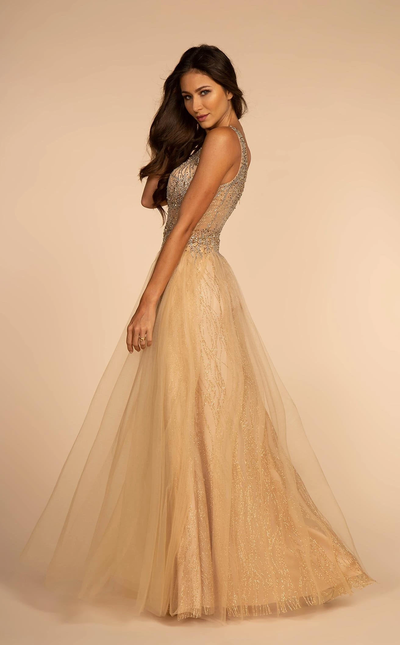 Slip into this fairy dress from the house of Elizabeth K GL2618. Flaunting an elegant and dreamy look, the dress has a V-neck and zippered back. Its bodice is embellished with sequins and glitter while the pleated skirt has glitter inlay underneath the mesh lining. This floor-length dress has a natural waistline and A-line silhouette.
