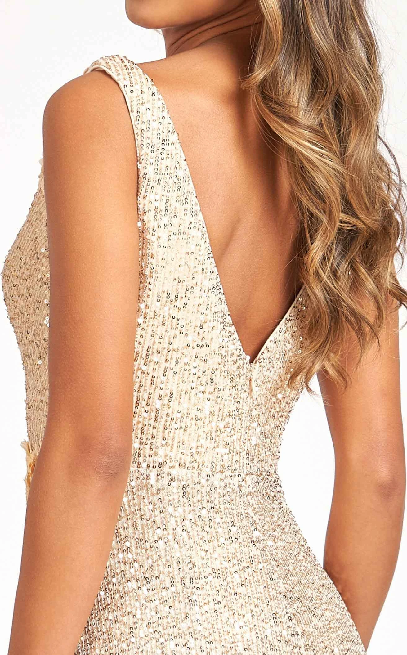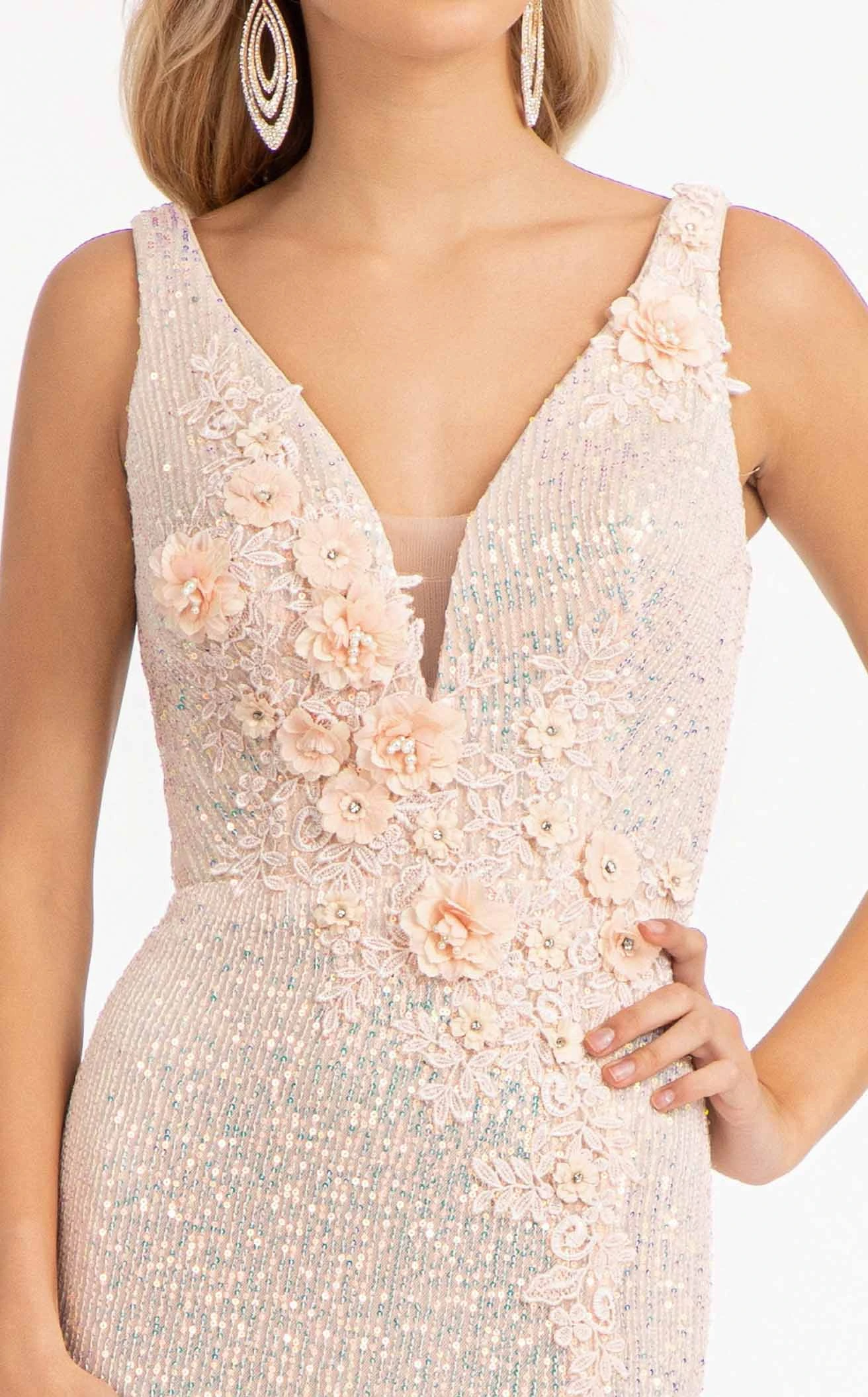 Designed by Elizabeth K GL3056 to give you the most dazzling look, this dress is a rare piece of fashion. The floor-length dress has 3D floral embellishments on the bodice. The neckline plunges with an illusion detail at the center. It’s a long dress with a slit and sparkling elements from the top to the bottom.