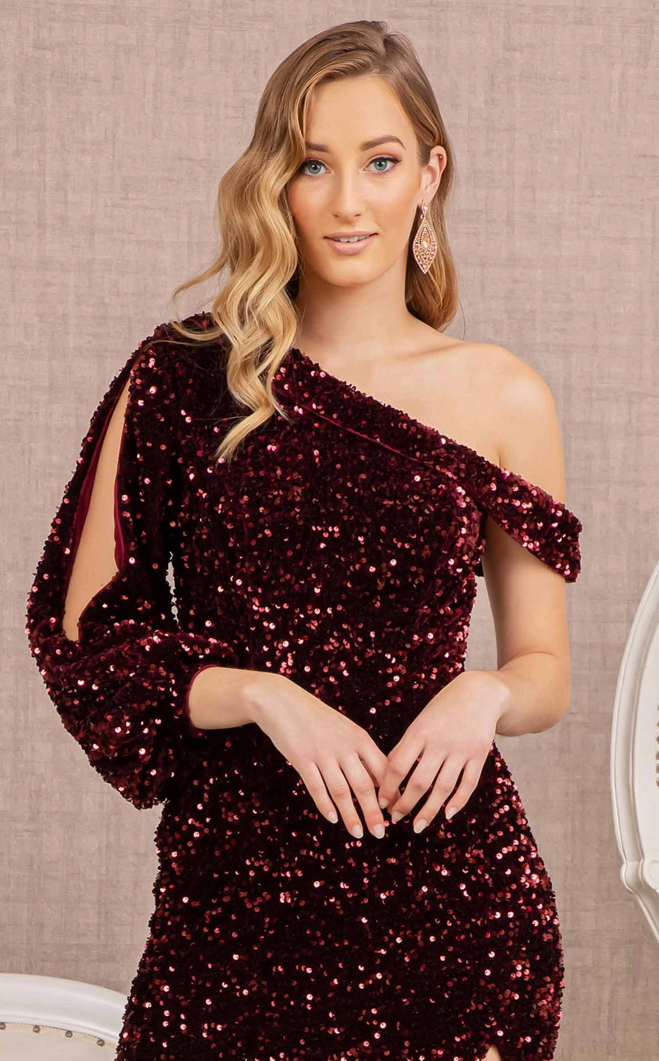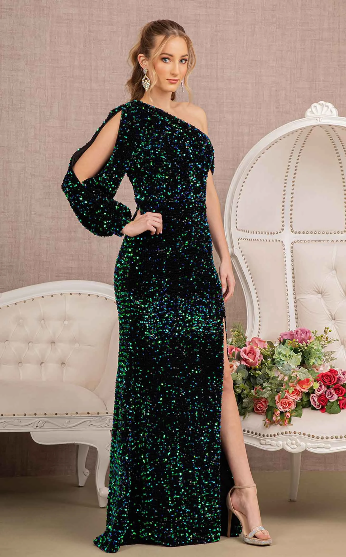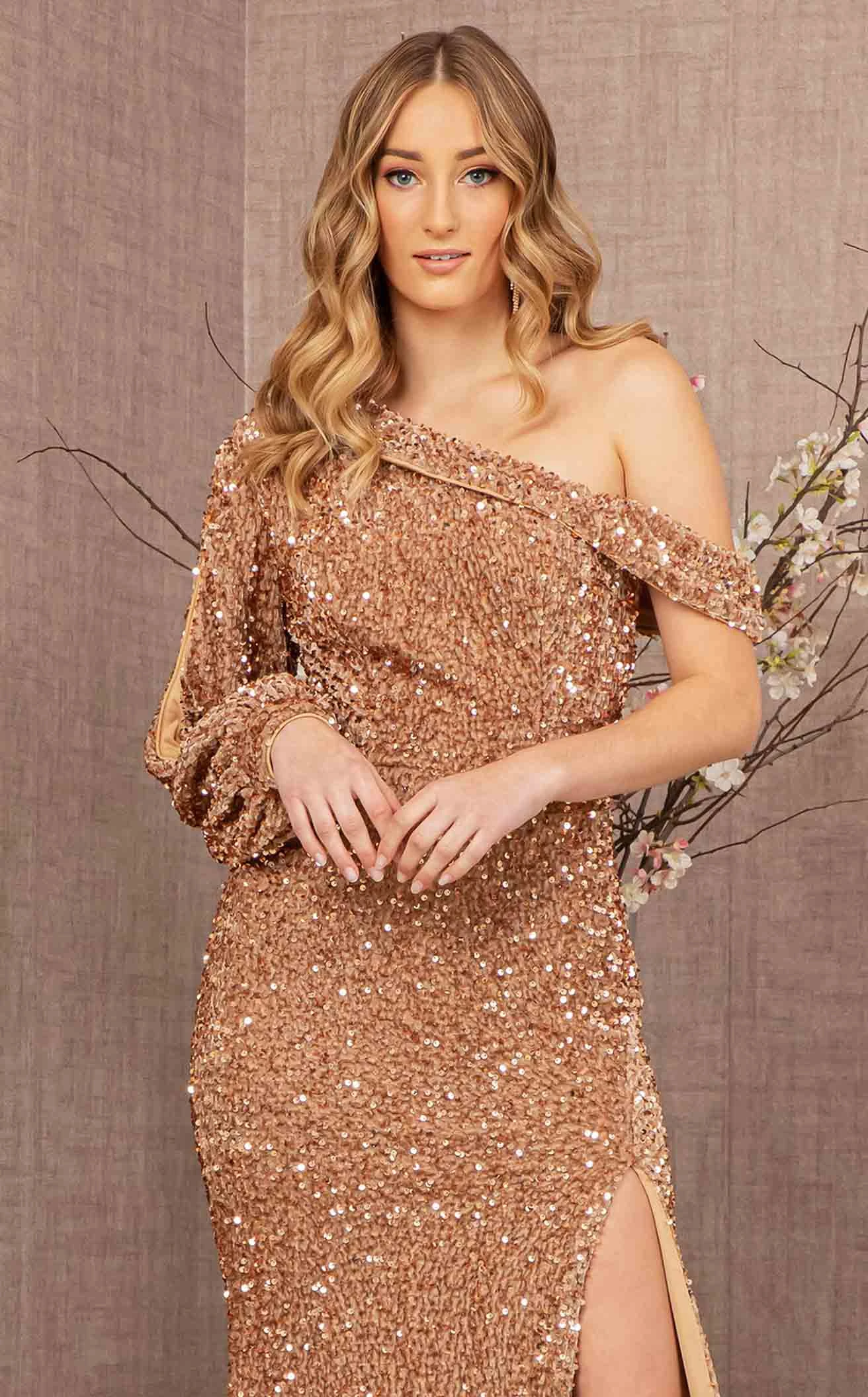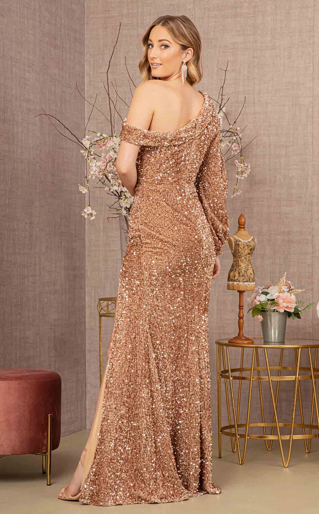 You will look like a million dollars in this vibrant dress designed by Elizabeth K GL3159. The dress has off-the-shoulder sleeves on one side and lantern sleeves on the other. With a boat neckline the gown is fully covered with shimmering beads and a floor-length straight-line silhouette reveals a slit cut.