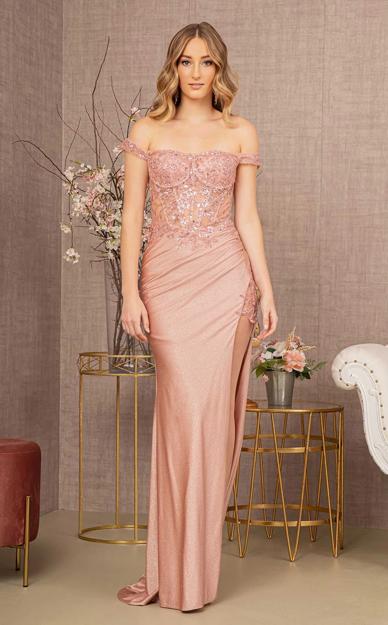 Impress everyone in this versatile dress designed by Elizabeth K GL3162. This dress offers a straight neckline with the illusion of a sweetheart neckline and is paired with off-shoulder sleeves. It has a corset bodice that is embellished with beaded lace and rhinestones. This strapless gown has a skin-tight straight-line silhouette with a slit cut.
