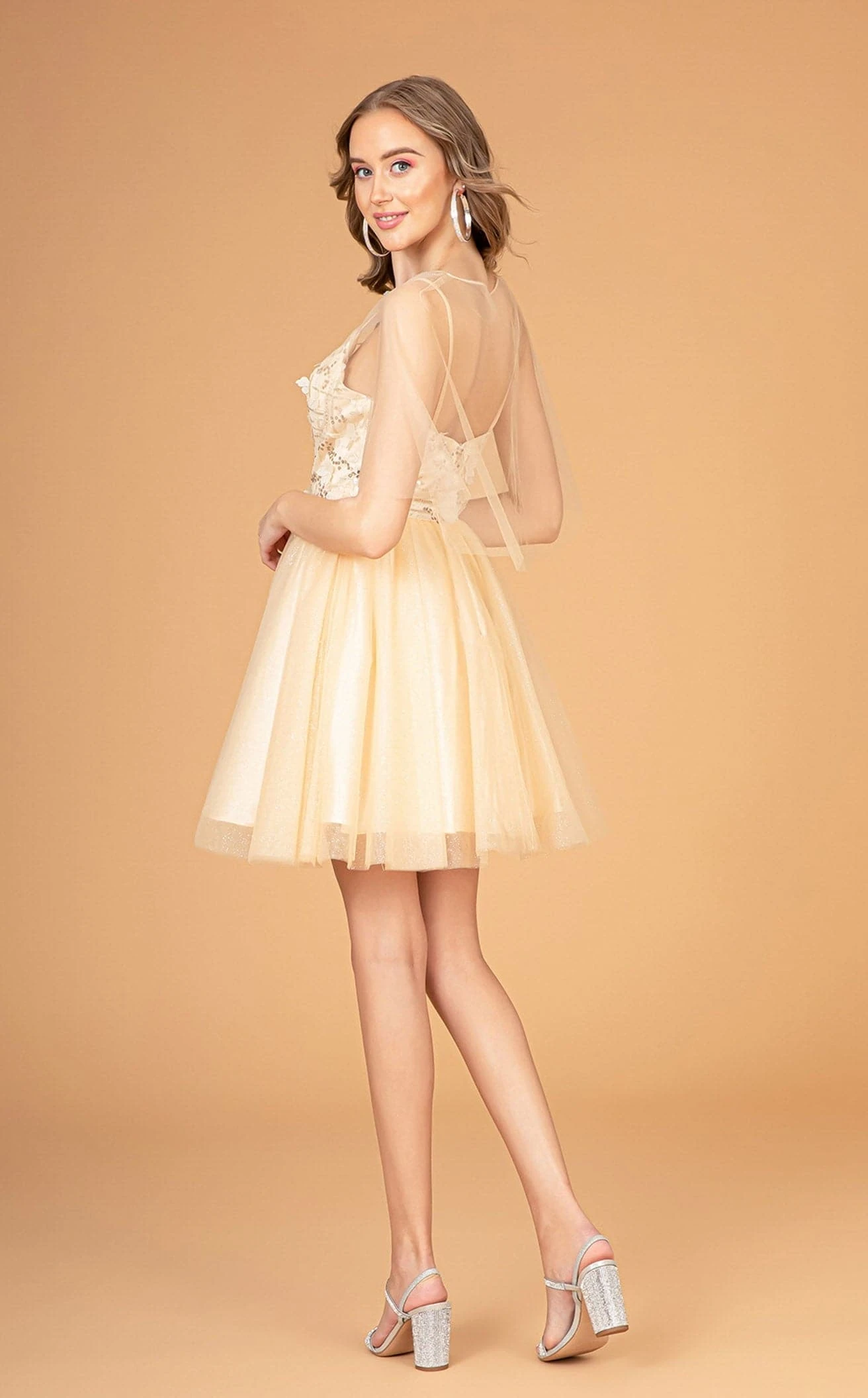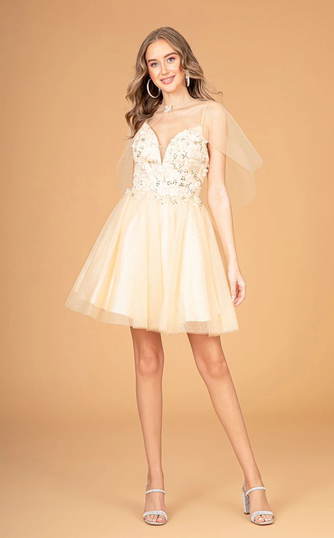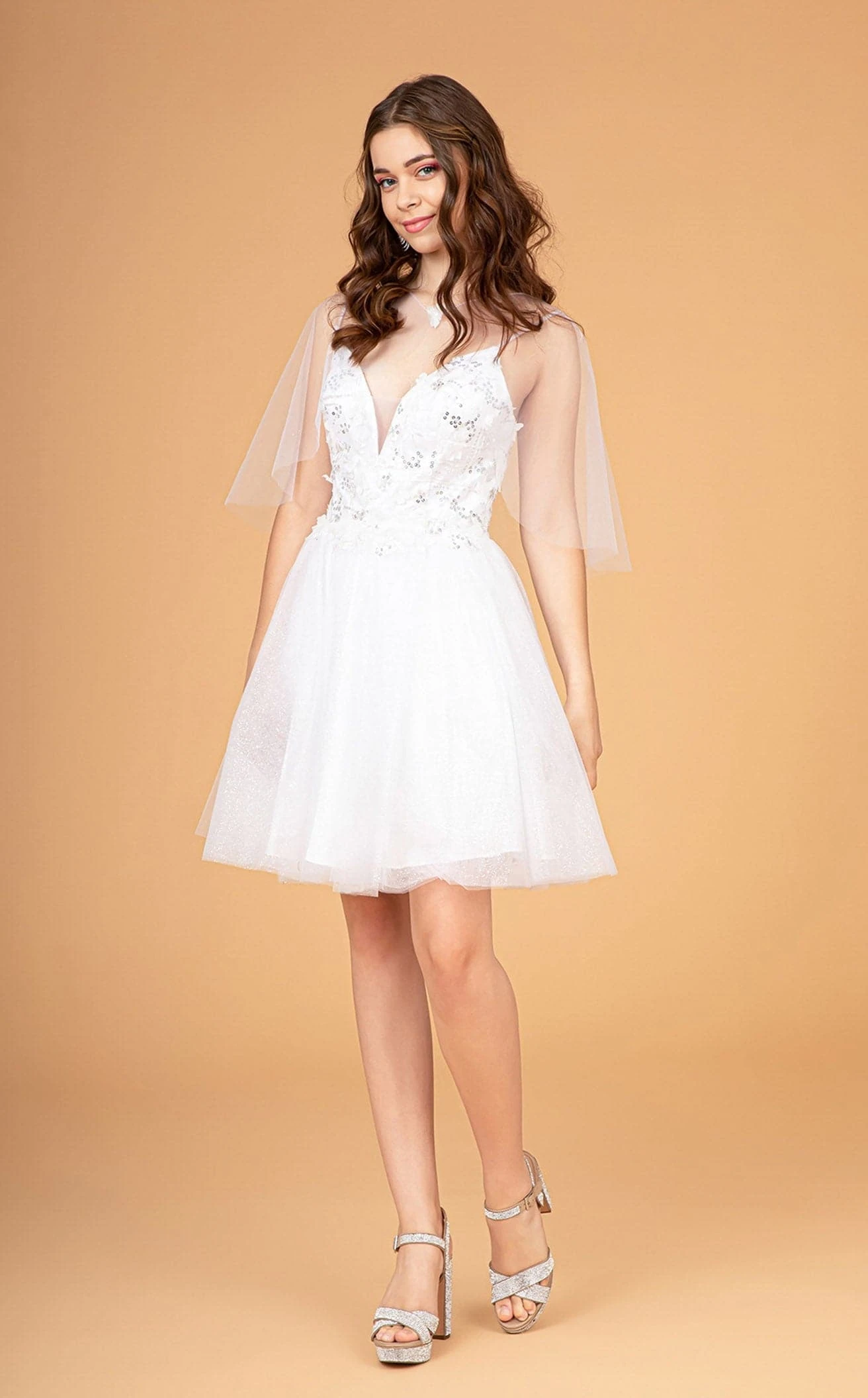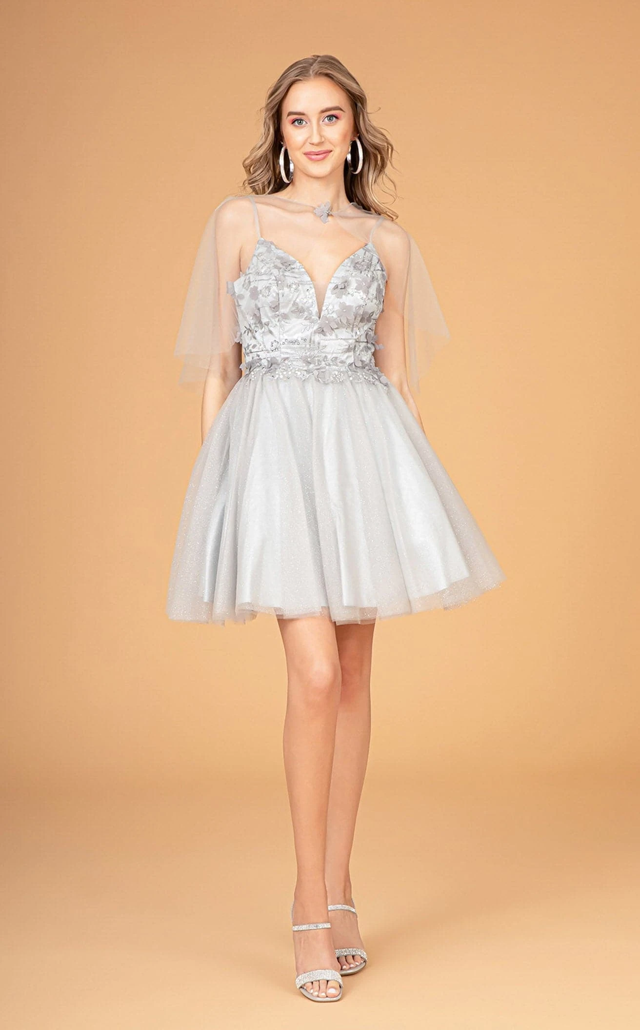 Show off your moves on the dance floor in this short dress by Elizabeth K. It has a deep sweetheart neckline with a mesh cape overlay. Covered in floral embroidery and sequins, the fitted bodice shines bright all the time. It features a skater skirt with a glitter mesh lining and pairs beautifully with ankle strap heels.