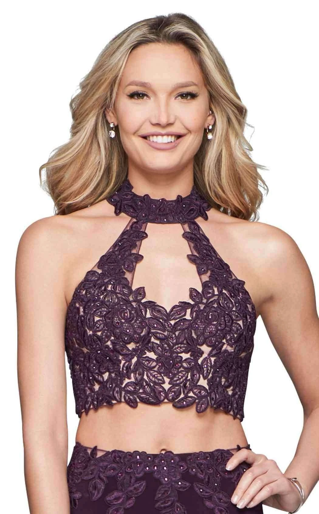Lavish your wedding party or special date with lush style in this leafy short formal set by Faviana 8071. The sleeveless bodice boasts on-trend halter styling with a stand-up collar strap and a curved cutout at center front. Lithe leaf appliques add decorative detail along the fitted bust and hips. Cropped styling bares the midriff, and the pencil-style skirt curves from waist to short hemline.