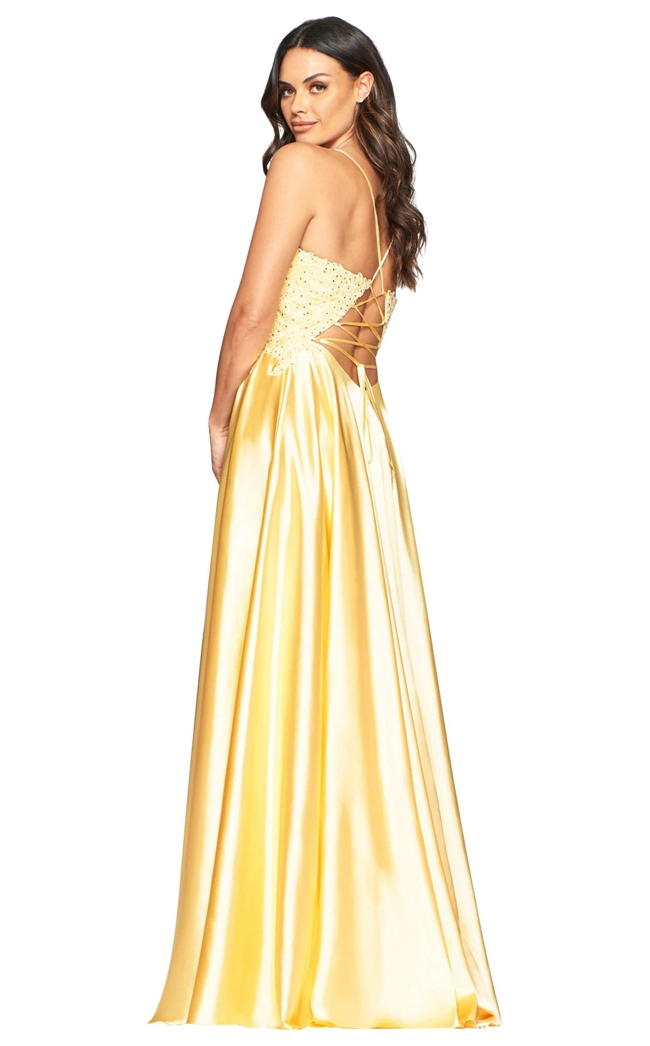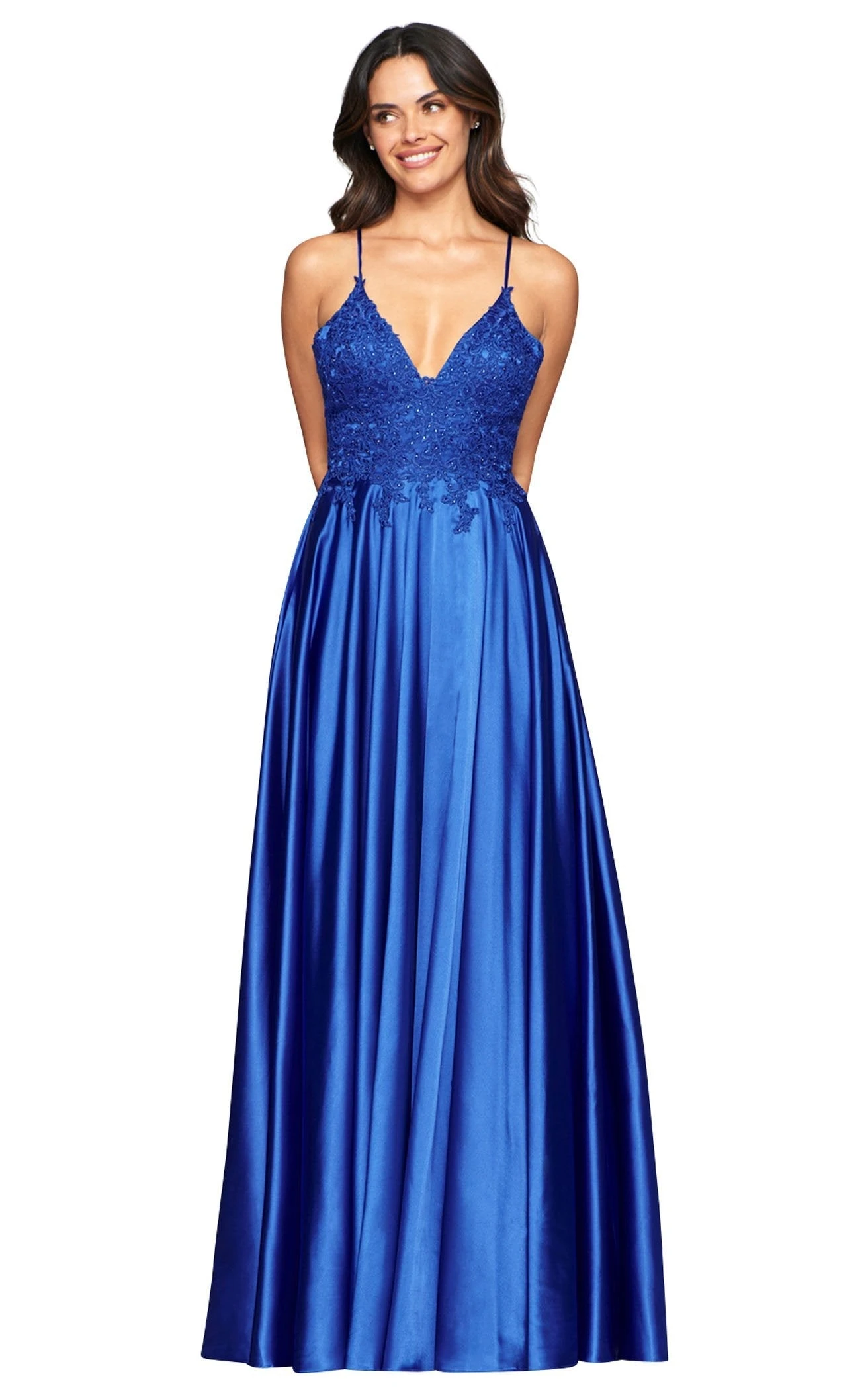 Gorgeous V-neck bead lace appliqued A-line long dress by Faviana