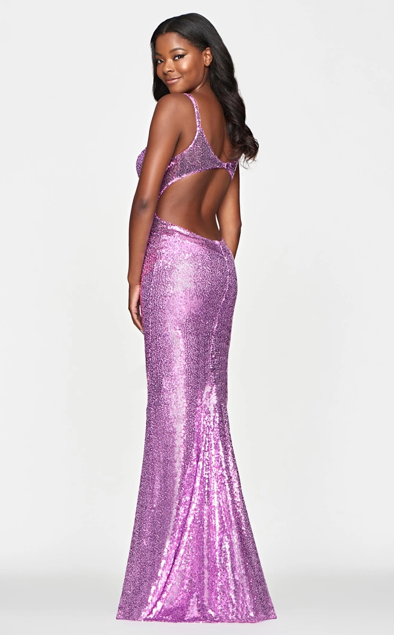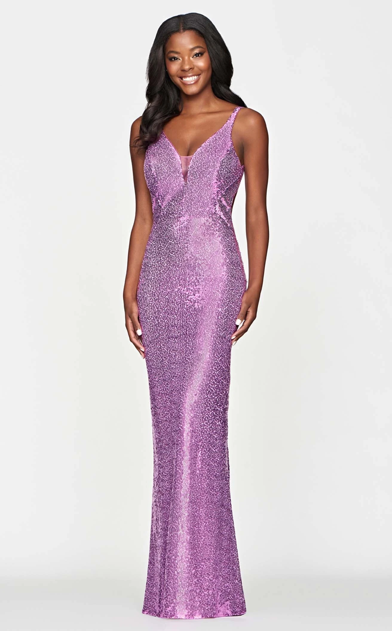 A long gorgeous sequin dress with a stunning v-neckline by Faviana will make your prom night memorable for years to come. The wrap detail at the waist flowing into a fit and flare skirt and a fitted bodice accentuate your curves. The sheath gown comes with an invisible zipper and hook and eye closure.