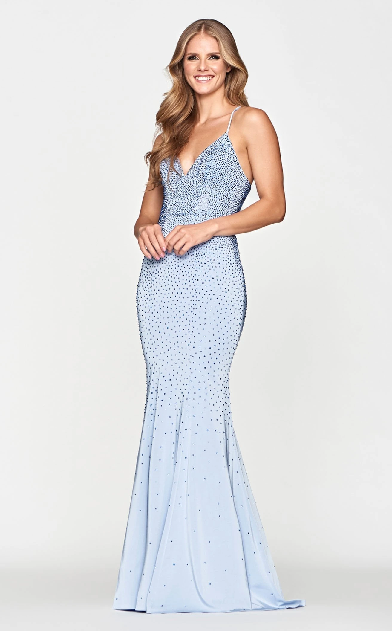 Look like a diva in this divine dress by Faviana. The sleeveless bodice features a sweetheart neckline with delicate spaghetti straps spanning across the shoulder with a lace-up back giving you a sultry appeal. The dress is handmade in long stretch faille satin fabric. It is fitted along the bust, waist and hips to give you a curve-kissing fit. The column silhouette gracefully cascades along the waist to the floor in loosely pleated full-length hem.