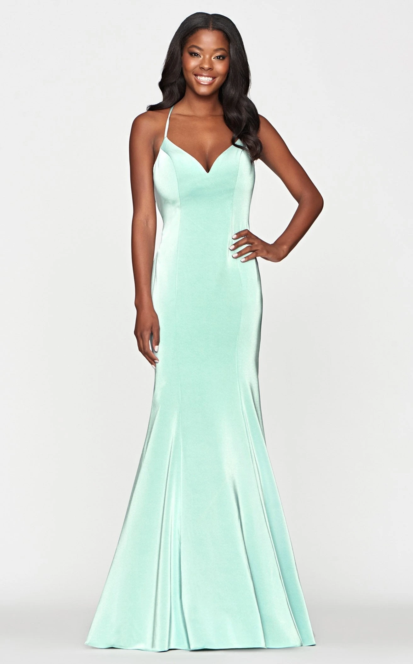Look extremely stunning in this classy dress by Faviana. The mesmerising dress is adorned in satin fabric in a romantic V-neckline with delicate straps spanning across the shoulder and a criss-cross open back to give you a sultry appeal. The sleeveless bodice is fitted along the bust, waist and hips to give you a figure flattering look. The column silhouette gracefully cascades along the waist to the floor in a full-length hem.