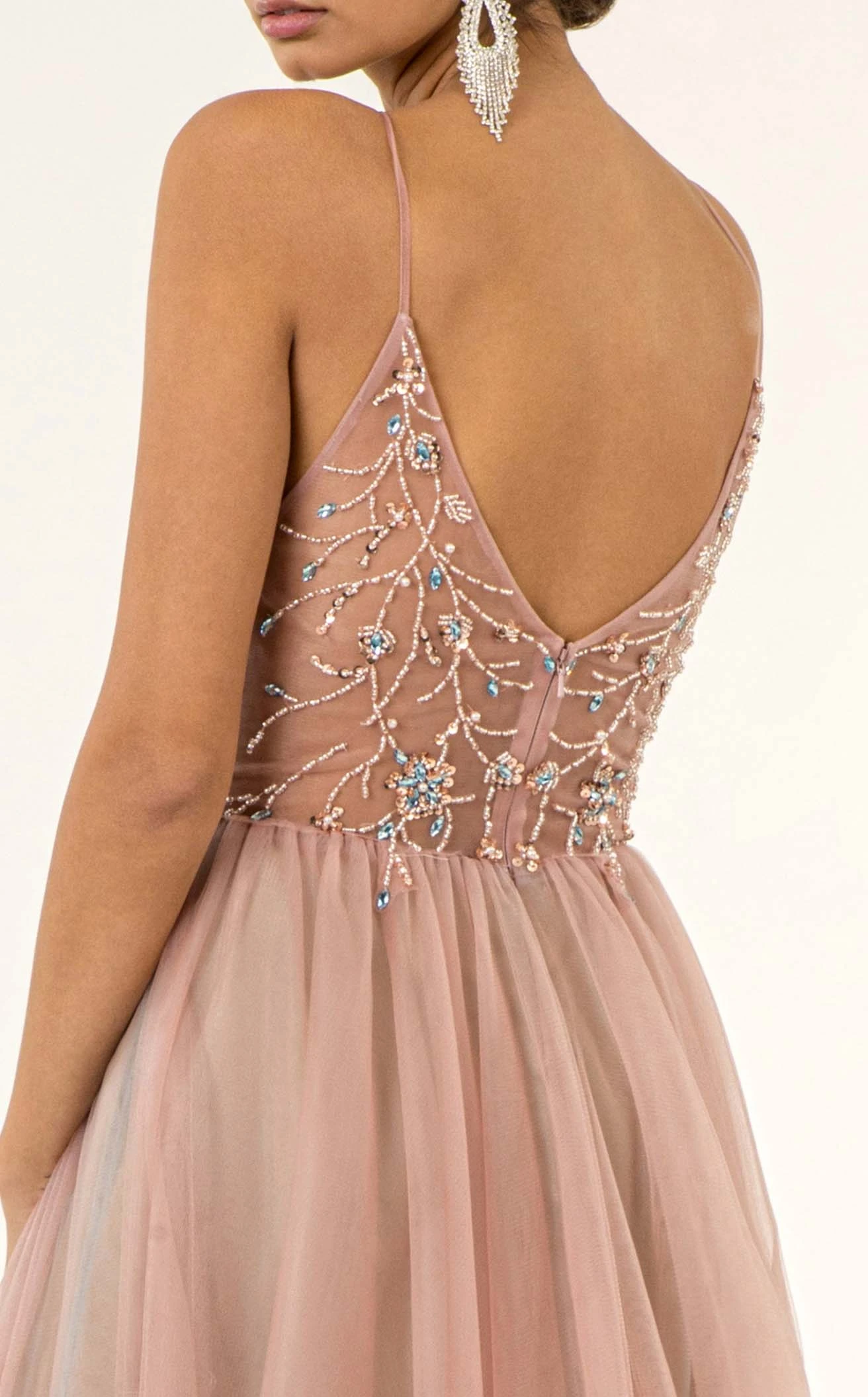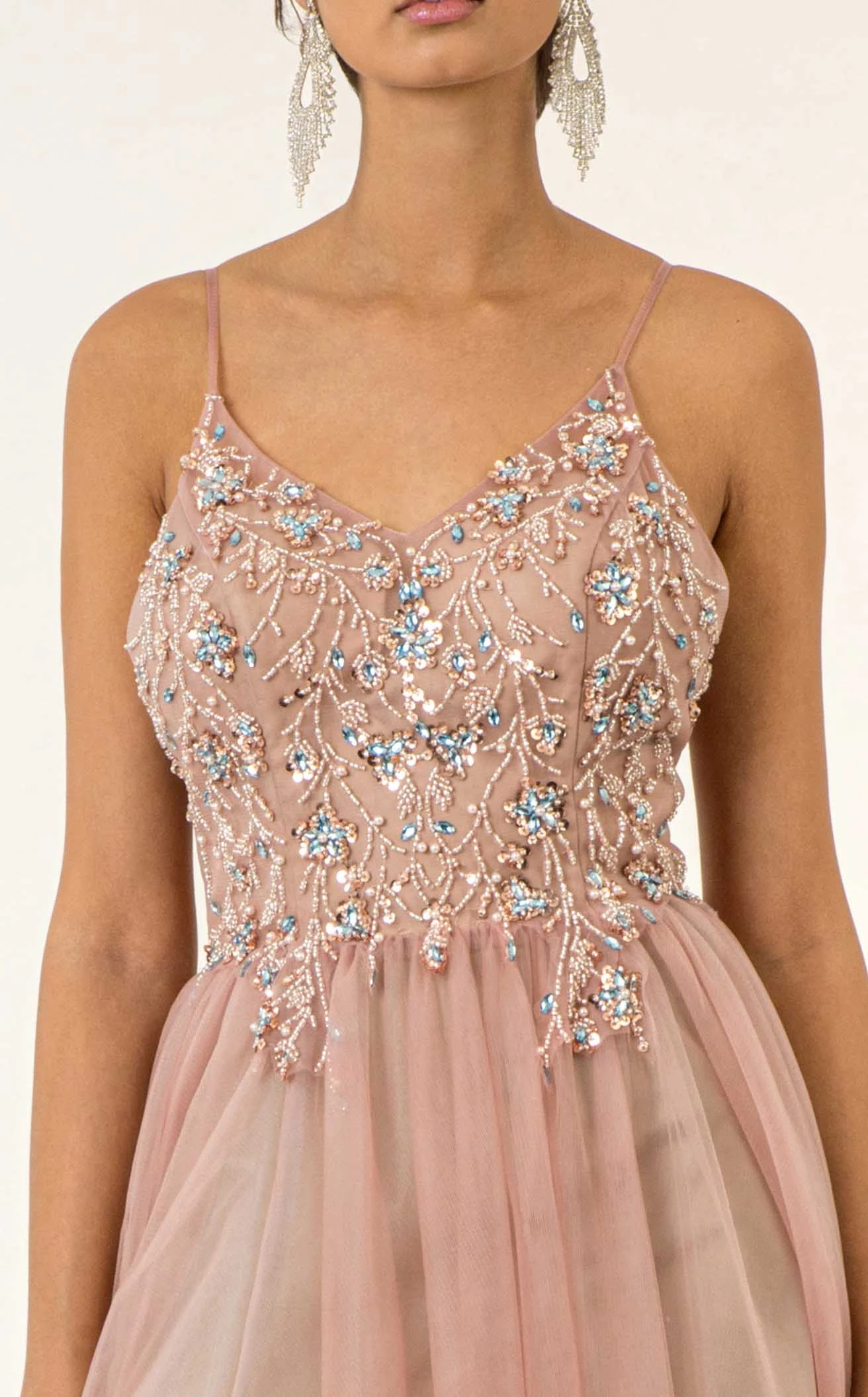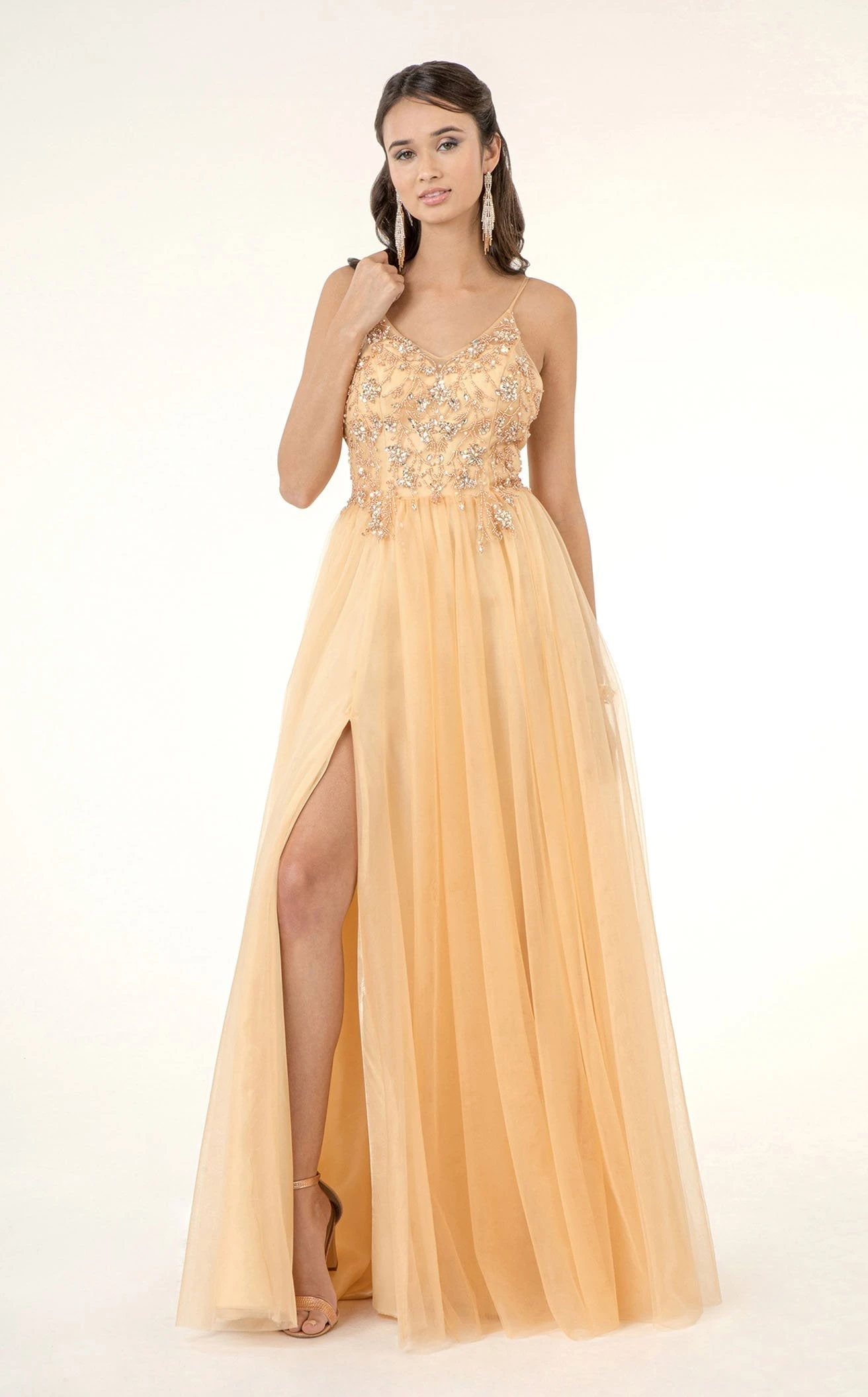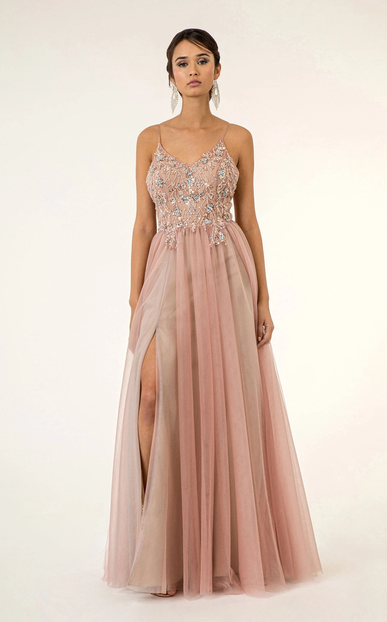 Create an effortless look in this elegant and charming dress from GLS by Gloria GL2983. The dress is accented in bead and sequin embellishments along the torso. Featuring a V-neckline with delicate spaghetti straps spanning across the shoulder and an open V-back with zipper gives you a sultry appeal. The sleeveless bodice is fitted along the bust and waist and is loose at the hips. Flaunt your sexy legs in an eye-catching front side slit. The A-line silhouette dress flares to the floor in a full-length hemline.