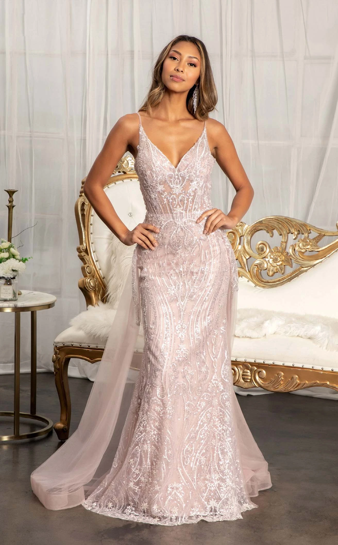 Create fashionable and chic memories with this gorgeous dress designed by GLS by Gloria GL3043. Ornate designs from the top to the bottom make this strappy dress a sight to behold. Added to it, is a mesh overskirt that acts like a flowing cape from the waistline. The long dress is magnificent with a deep V-neckline.