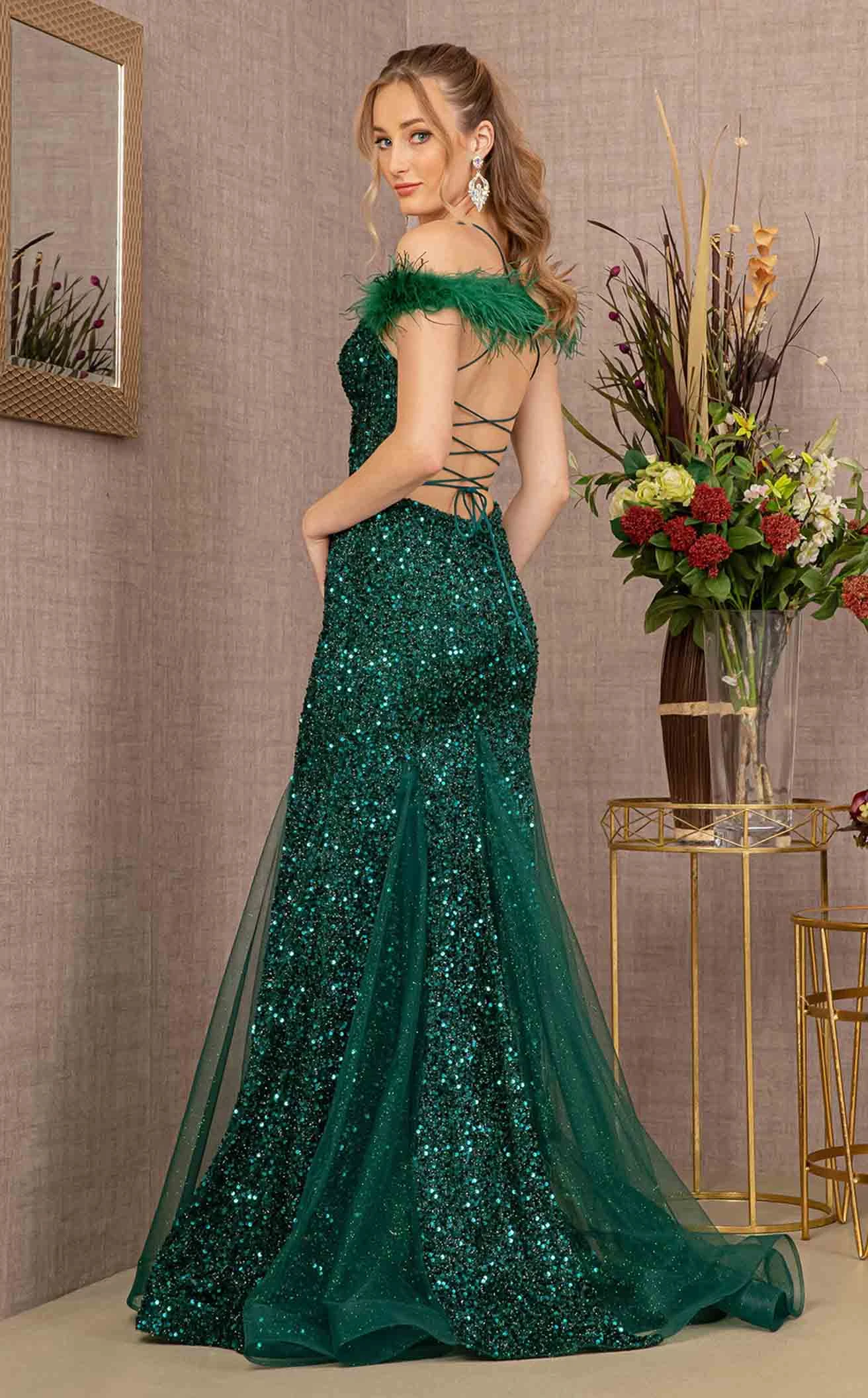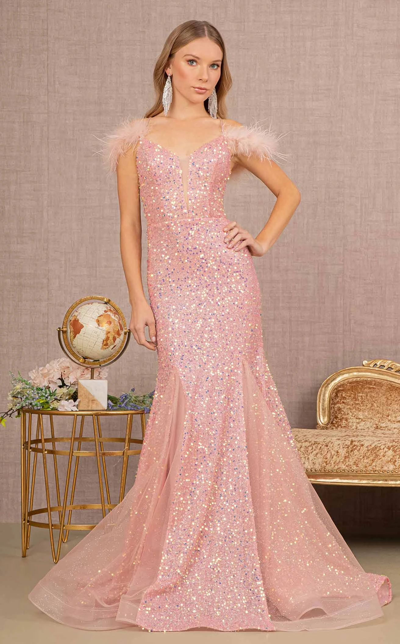 Love the ethereal shine and glittery appeal of this beautiful GLS by Gloria GL3130 dress. It has a sweetheart neckline with a mesh plunging V layout. The skinny shoulder straps form a lace-up back accompanied by feathery off-shoulder sleeves. With a fitted bodice, the natural waistline of this full-length dress follows a trumpet silhouette. It also features a mesh godet layout.