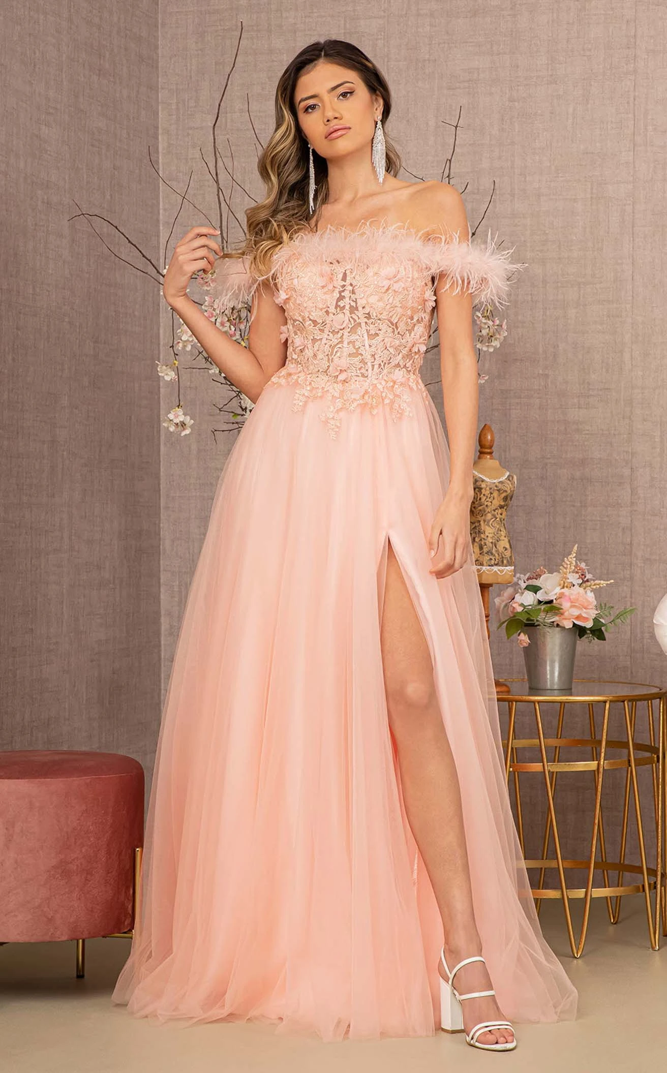 Leveling up the glam game has become easier with this beautiful dress designed by GLS by Gloria GL3138. It has a straight across neckline embellished with a monochromatic feathery hem that forms an off-shoulder design. With defined cups, the illusion bodice has embroidered detail of sequins and three-dimensional flowers. This full-length dress features a natural waistline and a mesh A-line skirt.
