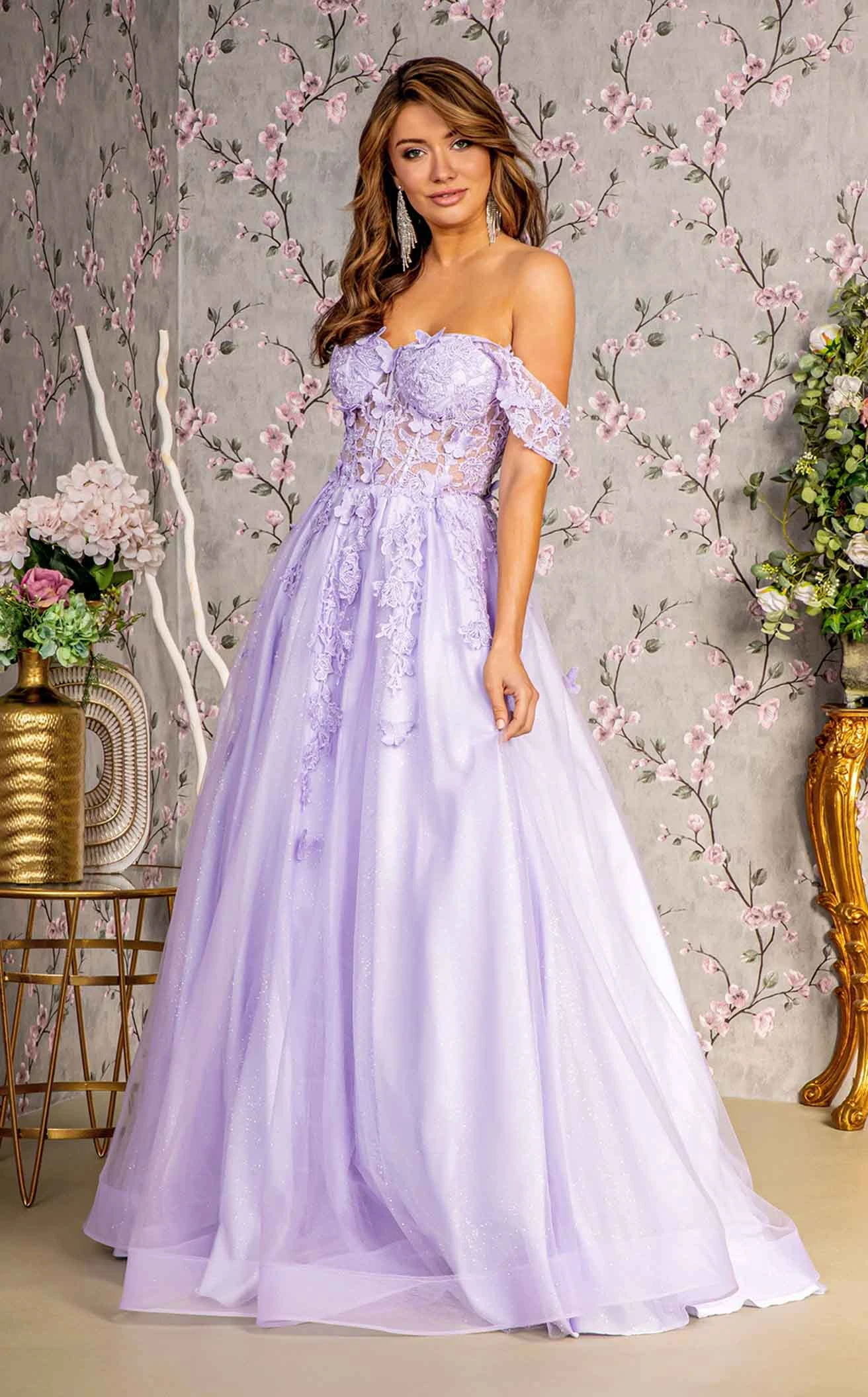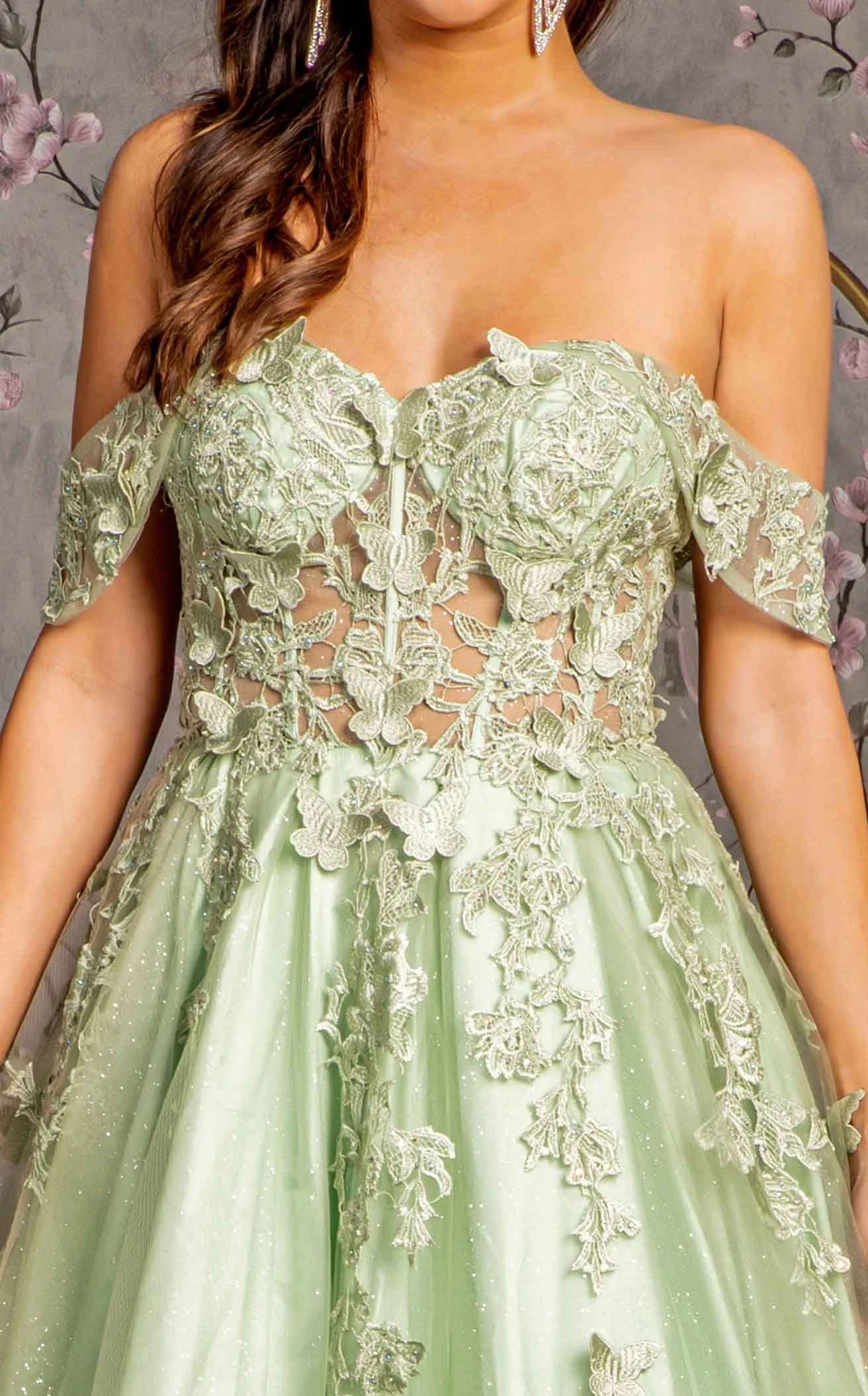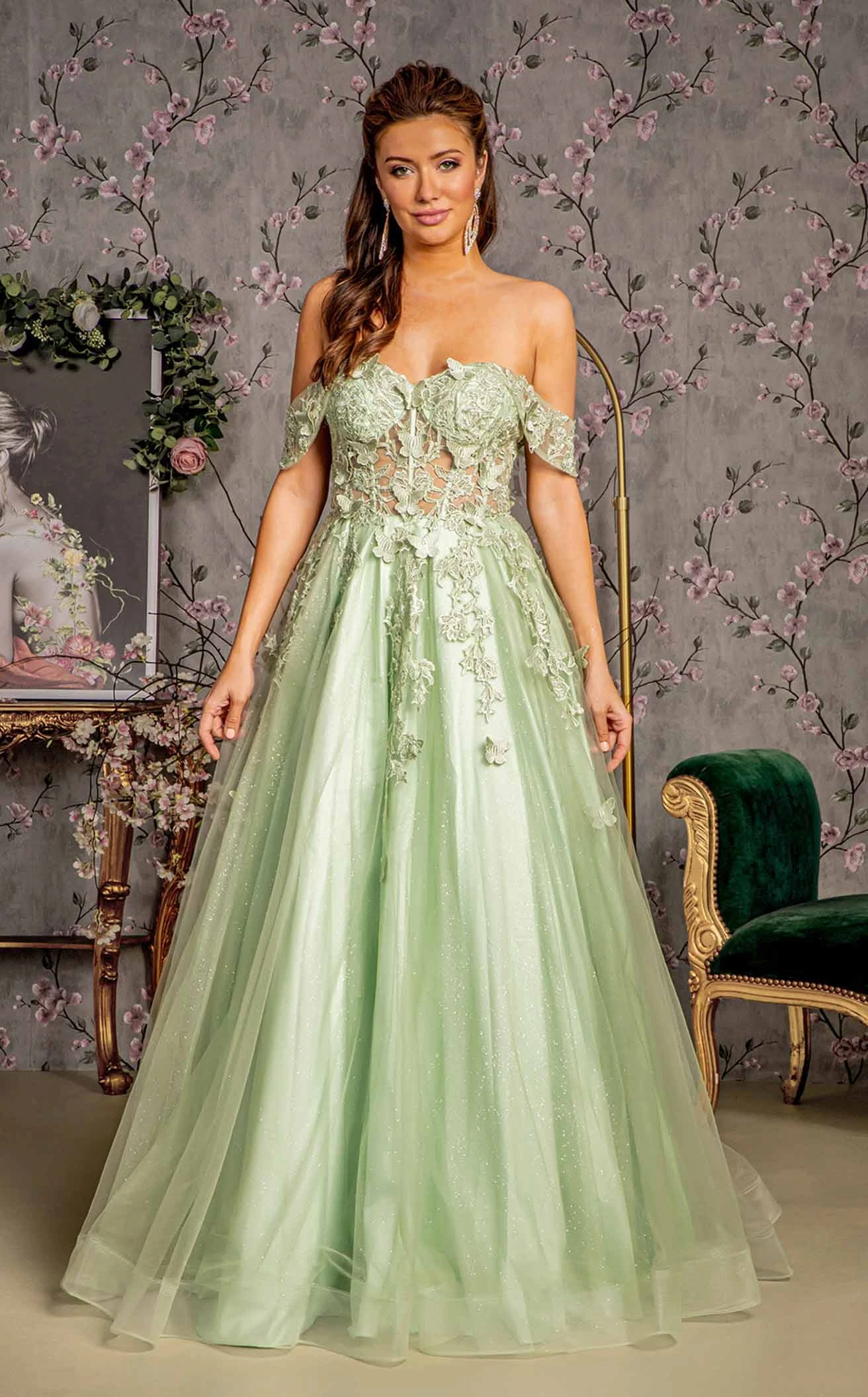 Head for a memorable evening in this ethereal GL3296 GLS by Gloria dress. The sheer boned corset has an off-shoulder sweetheart neckline and a midrise back. Its butterfly appliques drop in a graceful pattern and the A-line skirt flaunts a shimmer effect. Ending with a brush of sweep train, this long dress leaves behind a trail of admirers.
