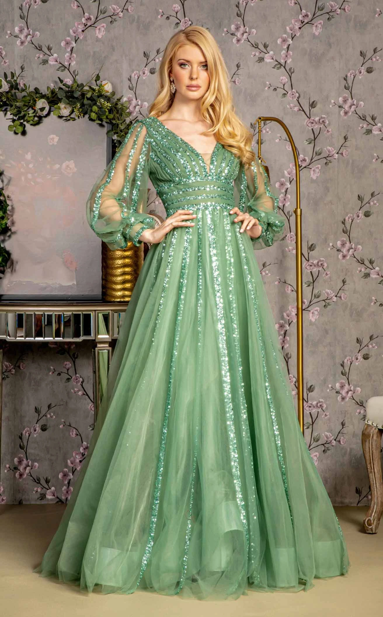 Elevate your fashion quotient in the GL3495 dress by GLS by Gloria. Its V-neckline offers an elongated effect. The addition of balloon sleeves introduces a touch of whimsy and contemporary charm. The A-line silhouette gracefully enhances the figure, offering a flattering and versatile fit for all body types.