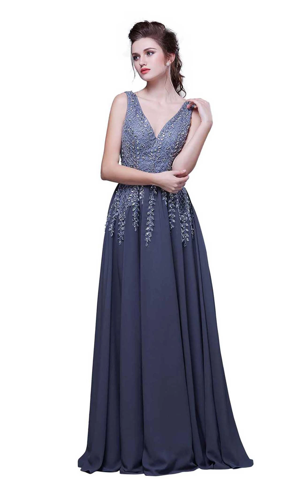 Claim that look of beauty wearing this A-line gown designed by Jadore J13064. It has fitted bodice with plunging V-neckline and a fully V-open back for a romantic overtone. The floral beaded appliqués accentuate the bodice and the thighs of the gown. The gown flares from the waistline into a graceful pleated A-line skirt that ends with a subtle train detail.