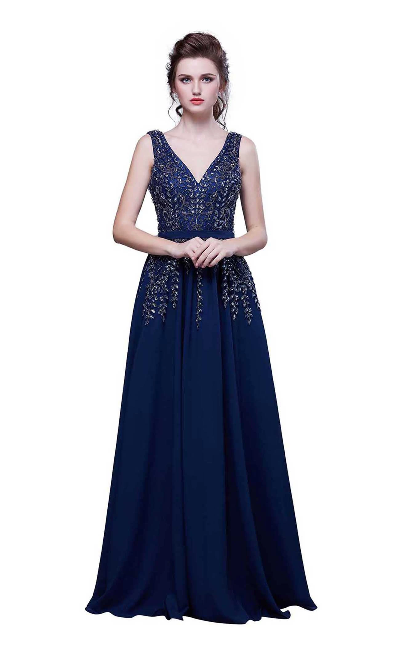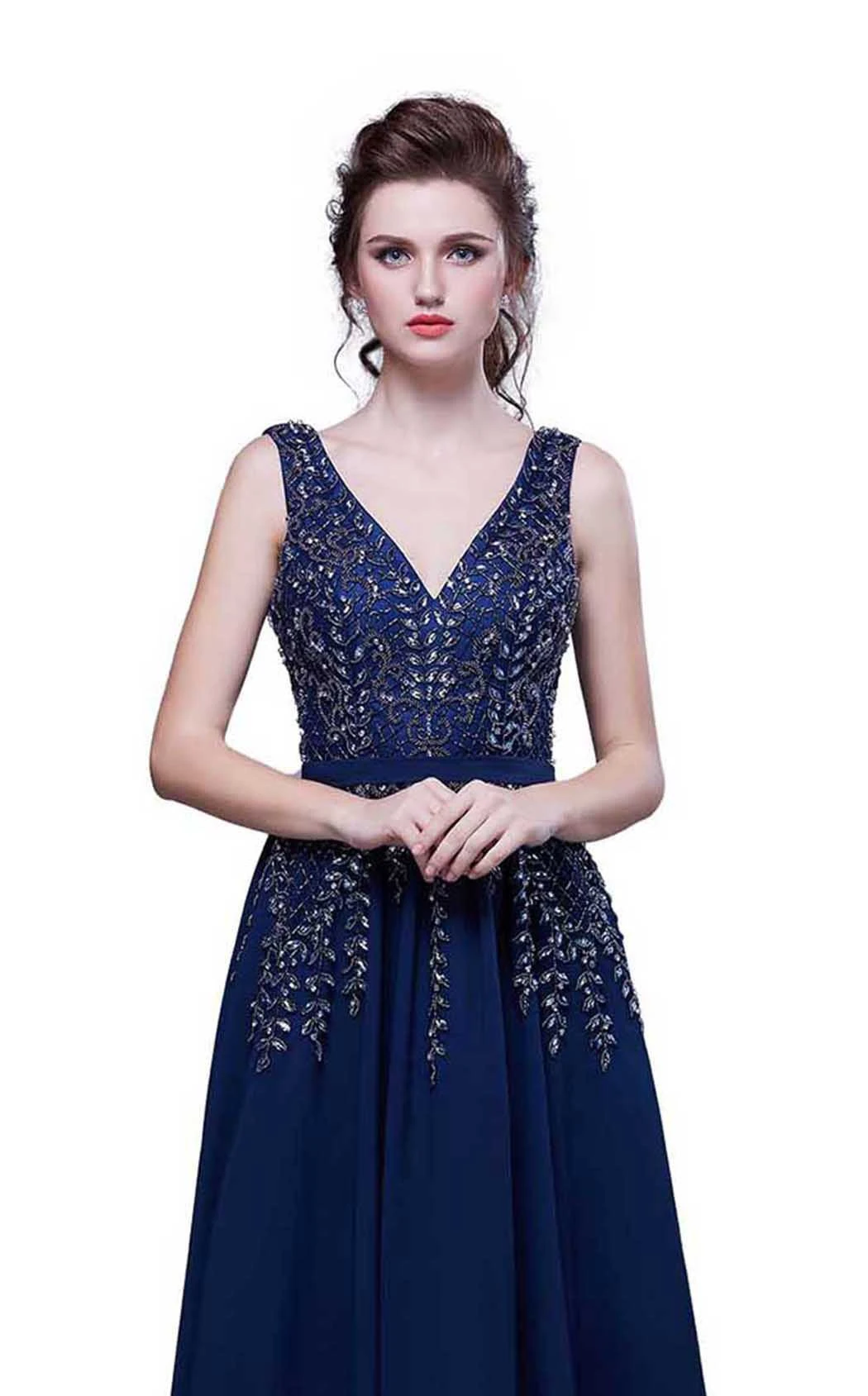 Dramatic beaded bodice sleeveless A-line gown designed by Jadore