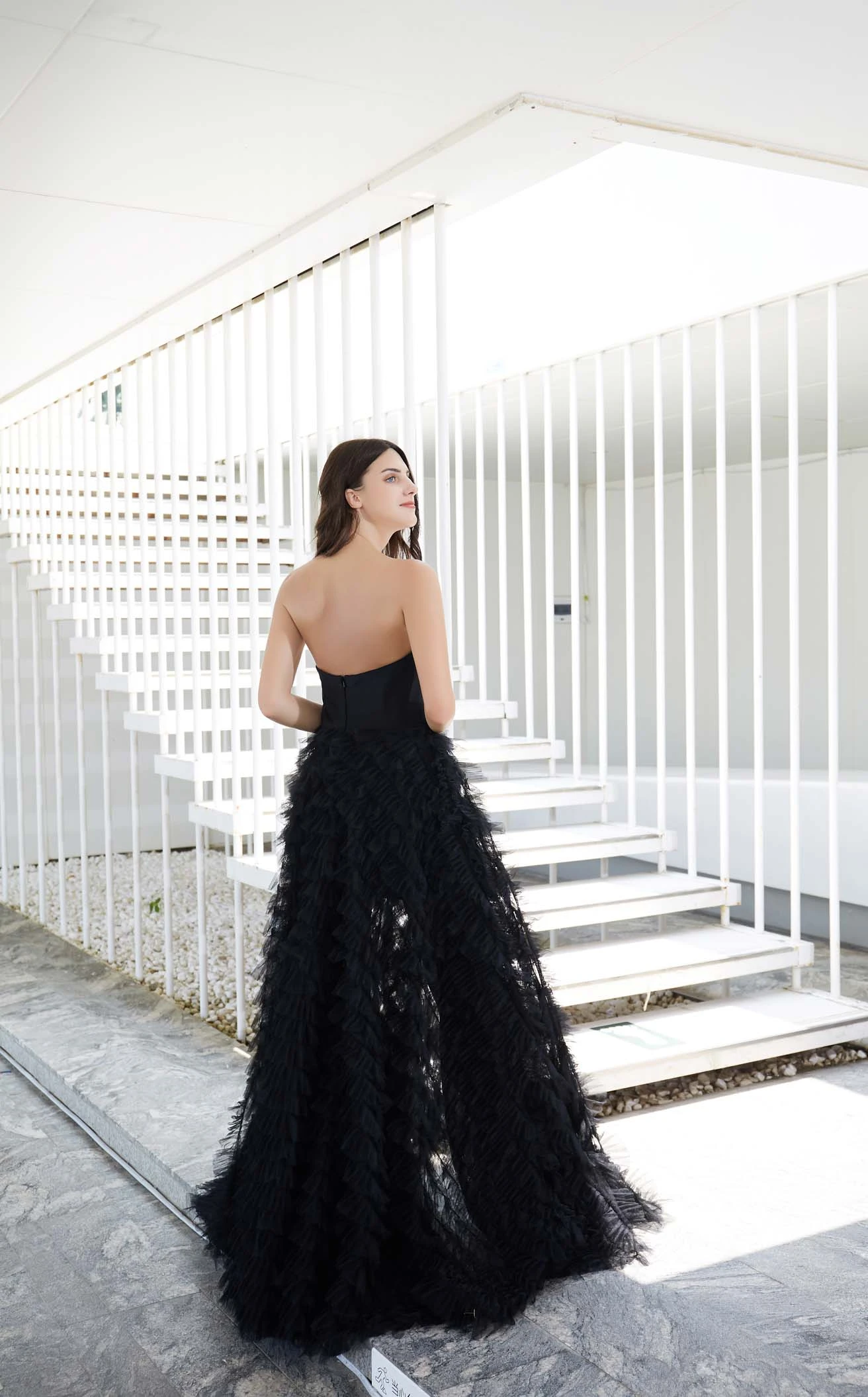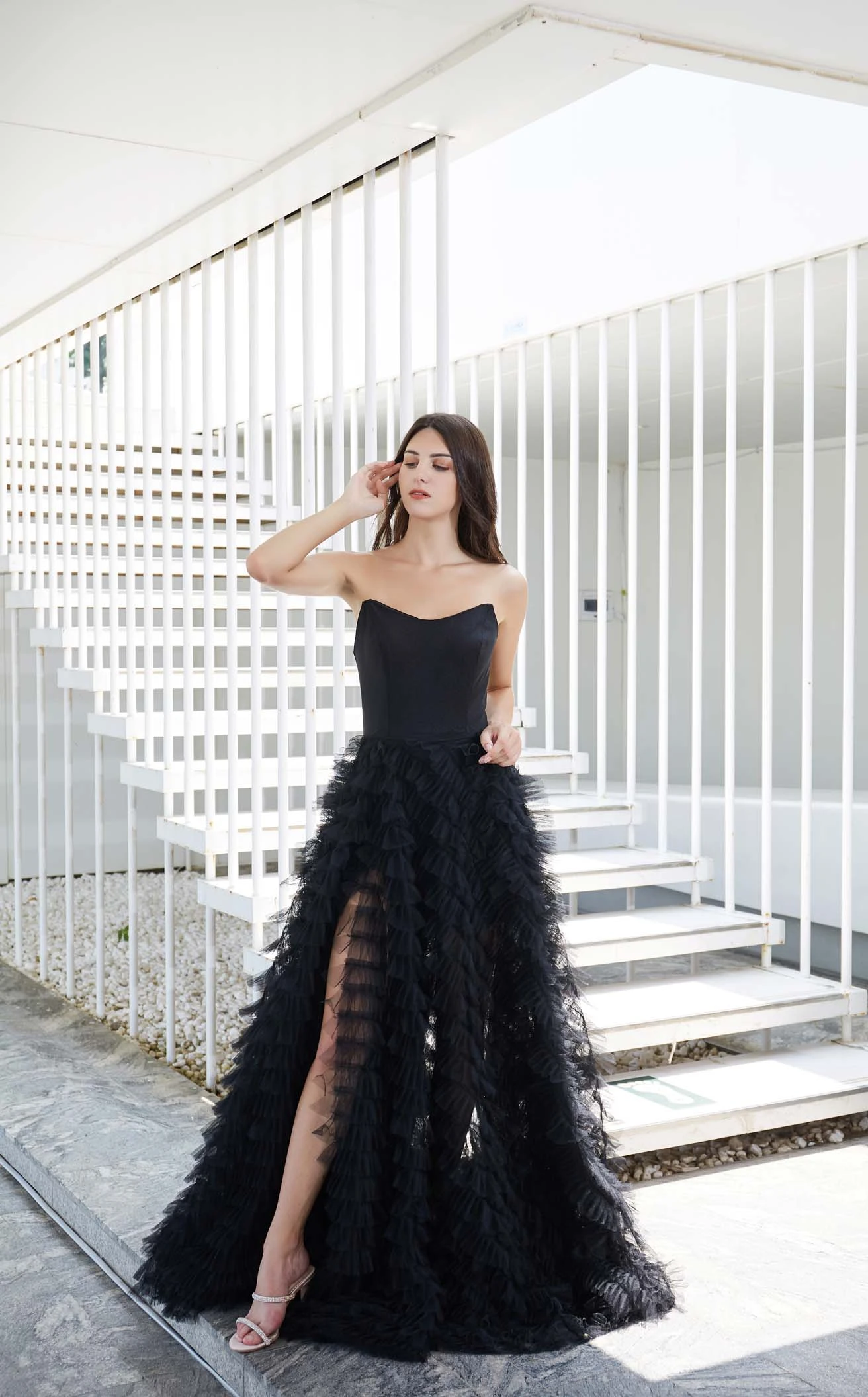 This ravishing long dress from Jadore J20009 represents the perfect marriage of grace and allure. The dress is strapless and it highlights a modified sweetheart neckline over the fitted bodice. All charm of this dress lies in its full-length skirt, which is filled up with intricate frills all over and is parted with a bold thigh-high slit, completing the look of the A-line silhouette.